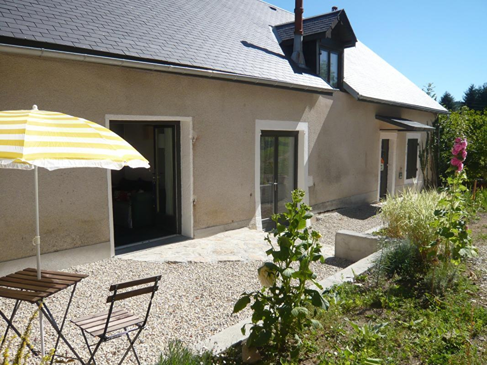 Allemande d'origine & morvandelle d'adoption, guide conférencière polyglotte sur le célèbre site voisin de Bibracte, Christiane vous accueille au sein d'une authentique ferme de pays fin 19ème siècle - intégralement restaurée dans les règles de l'art - chargée d'histoire, jadis villégiature régulière d'Antoine de Saint-Exupéry, ami proche d'un ancien propriétaire photographe, qui l'accompagnait en vol ! Paisible petit hameau résidentiel très calme, au creux d'un magnifique écrin naturel & champêtre vallonné de montagne douce, en lisière de prairies, rivière, bocage & vaste forêt. En bordure du centre du village, typique & commerçant, blotti sur le versant du Mont-Beuvray culminant à 821m, exceptionnel belvédère offrant une vue hors du commun (jusqu'au Mont-Blanc!), occupé en son sommet par "l'oppidum" de Bibracte, ancienne ville fortifiée gauloise, l'une des mieux préservées avec ses remparts & quartiers s'étendant sur 200 ha, au sein d'un remarquable site protégé classé en zone "Natura 2000". Spacieux gîte de très bon confort. Chaleureux cachet campagnard contemporain aux influences nordiques. Élégant "mix & match" alliant l'ambiance douce et dépaysante d'une "maison de famille" à une restauration patrimoniale soignée (charpente, linteaux en pierres, carreaux de ciment d'époque…). Vaste terrasse exposée & ombragée. Agréable jardin clos végétalisé et fleuri (framboisiers, pêcher, vignes…). Belle vue dégagée sur la campagne. Superbe paysage.