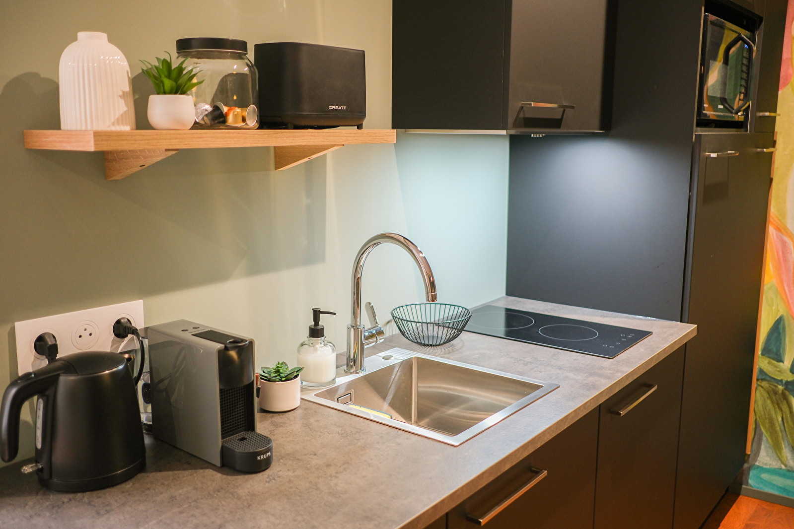 - cuisine équipée avec coin repas, four micro-ondes combiné, plaques de cuisson, hotte électrique, grand réfrigérateur, cafetière Nespresso, bouilloire et grille pain