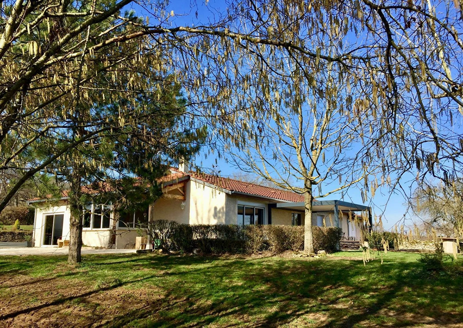 Dominique & Jean-Pierre vous accueillent au sein d'une villa contemporaine de style blottie au calme, "en balcon panoramique" à flanc de colline, en pleine campagne clunisoise, sur un coteau sud-est exposé dominant l'illustre cité bourguignonne de renommée mondiale - cœur spirituel de l'Europe médiévale au patrimoine historique inestimable - dotée du très rare & prestigieux label "Patrimoine Européen" (toutes commodités sur place). Totale tranquillité au sein d'un paisible hameau résidentiel niché en impasse au creux d'un magnifique écrin champêtre & naturel vallonné, en lisière immédiate de champs, prairies & forêts. Cadre & site préservé absolument enchanteurs. Sublime panorama & paysages. Superbe propriété de 3500m² (soigneusement arborée, végétalisée & fleurie) cerclée d'anciens murs en pierres sèches chargés d'histoire, ouverte sur le bocage environnant, dotée d'une agréable terrasse de 60m² exposée & ombragée (en partie abritée sous une pergola bioclimatique) et de nombreux équipements de loisirs (terrain de pétanque, table de ping-pong, jeux d'extérieur, jeux de société...) Gîte de grand confort aux dimensions nobles. Vaste pièce de vie (56m²). Chaleureux cachet campagnard aux accents contemporain mixant traditions & modernité. Élégante ambiance raffinée d'une demeure "bourgeoise" cossue aménagée dans l'esprit d'une "maison de famille". Prestations haut de gamme. Énormément de charme, style & caractère. Cosy & très douillet. Équipement complet de grande qualité.