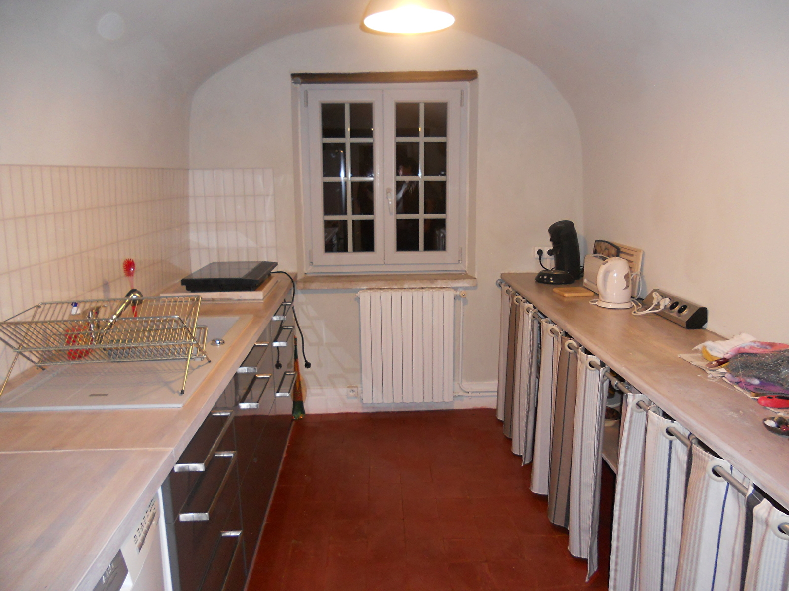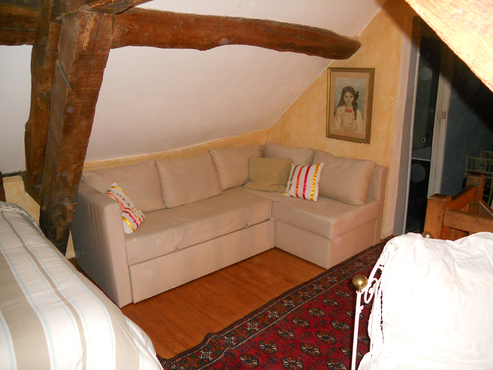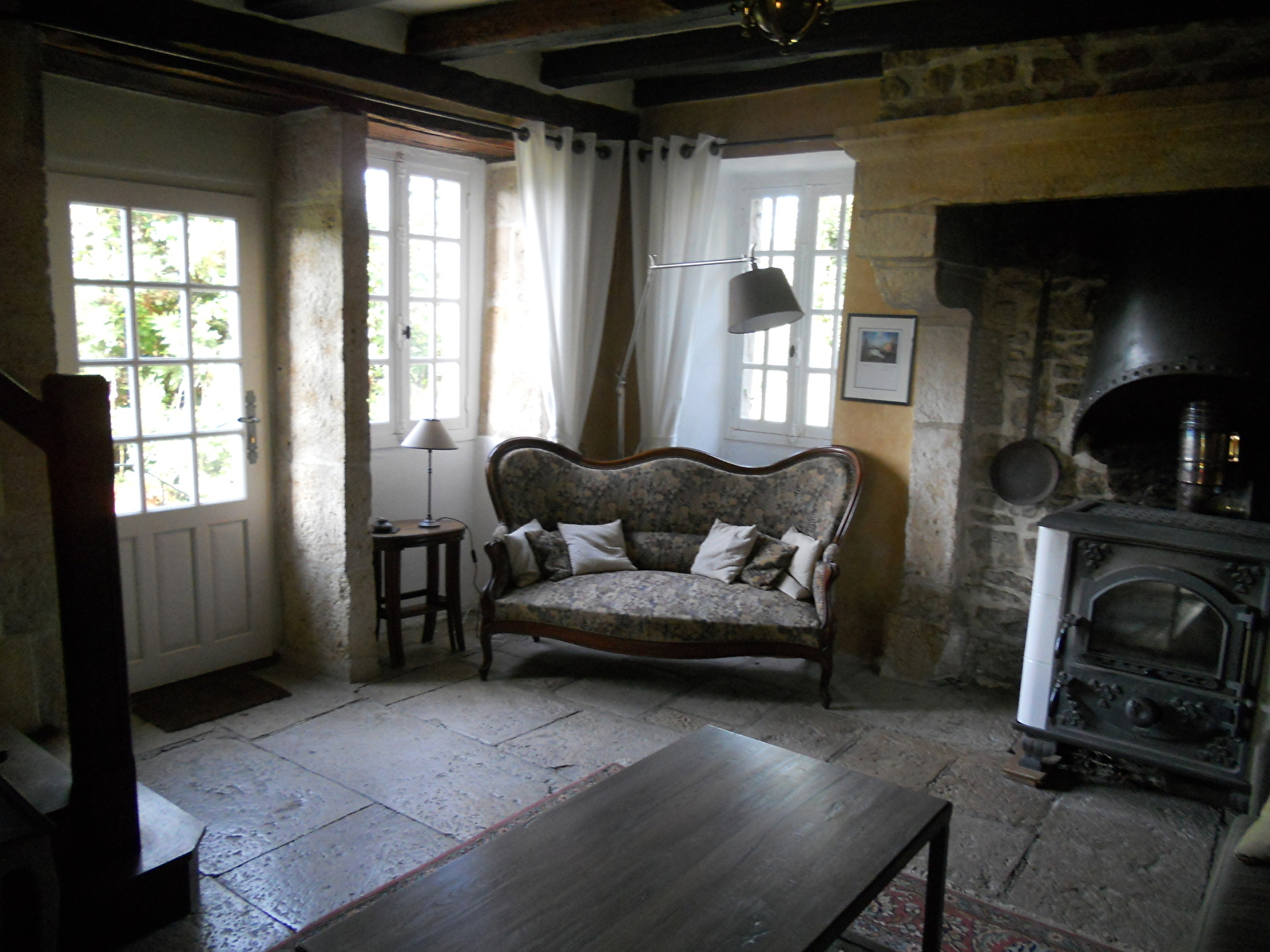 Comprenant : une entrée salle à manger, une cuisine indépendante entièrement équipée, WC séparés. Grand salon donnant sur le jardin avec cheminée et poutres ; canapés et chauffeuses (canapé lit - 1 pers, 2 pers ou double).