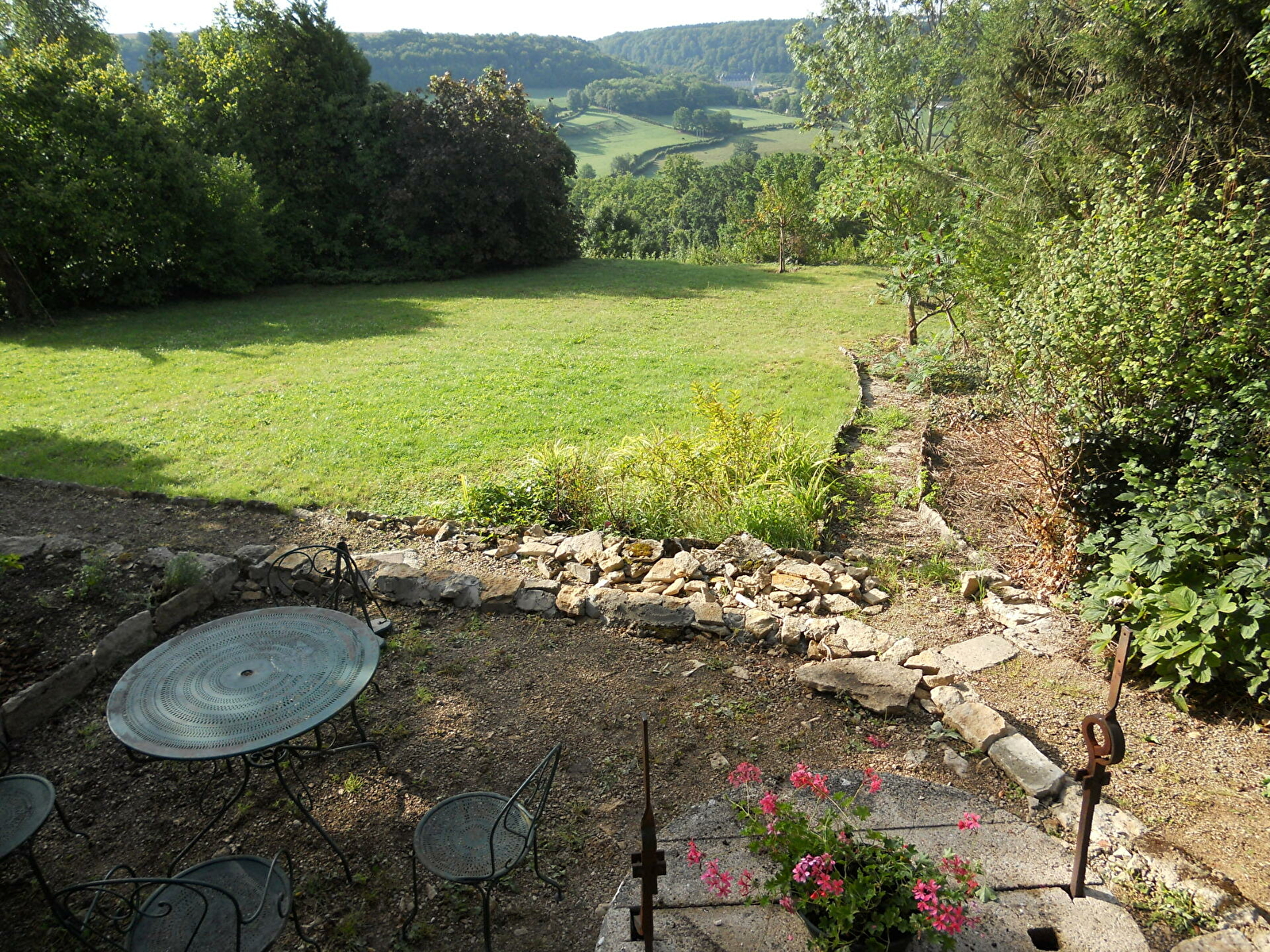 En contrebas : vaste terrasse aménagée plein sud sur grand pelouse privative et vue sur le chateau.