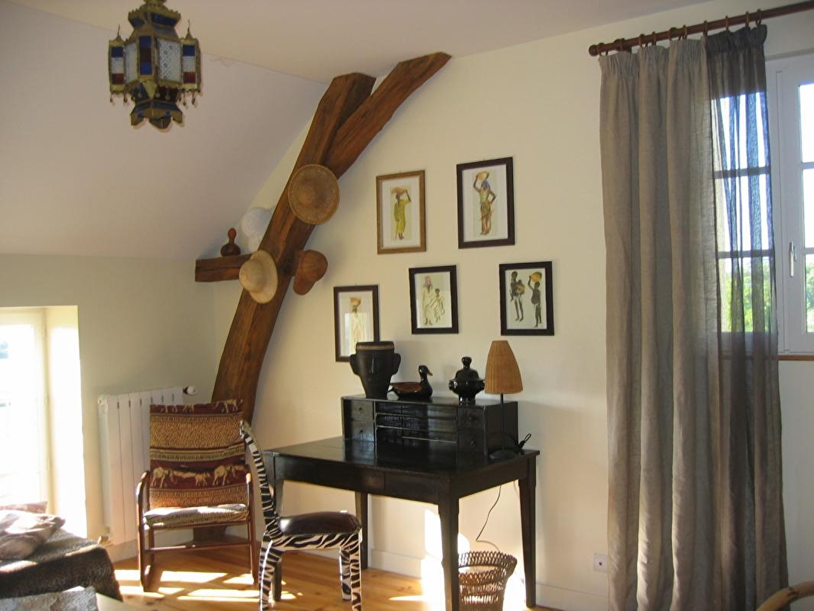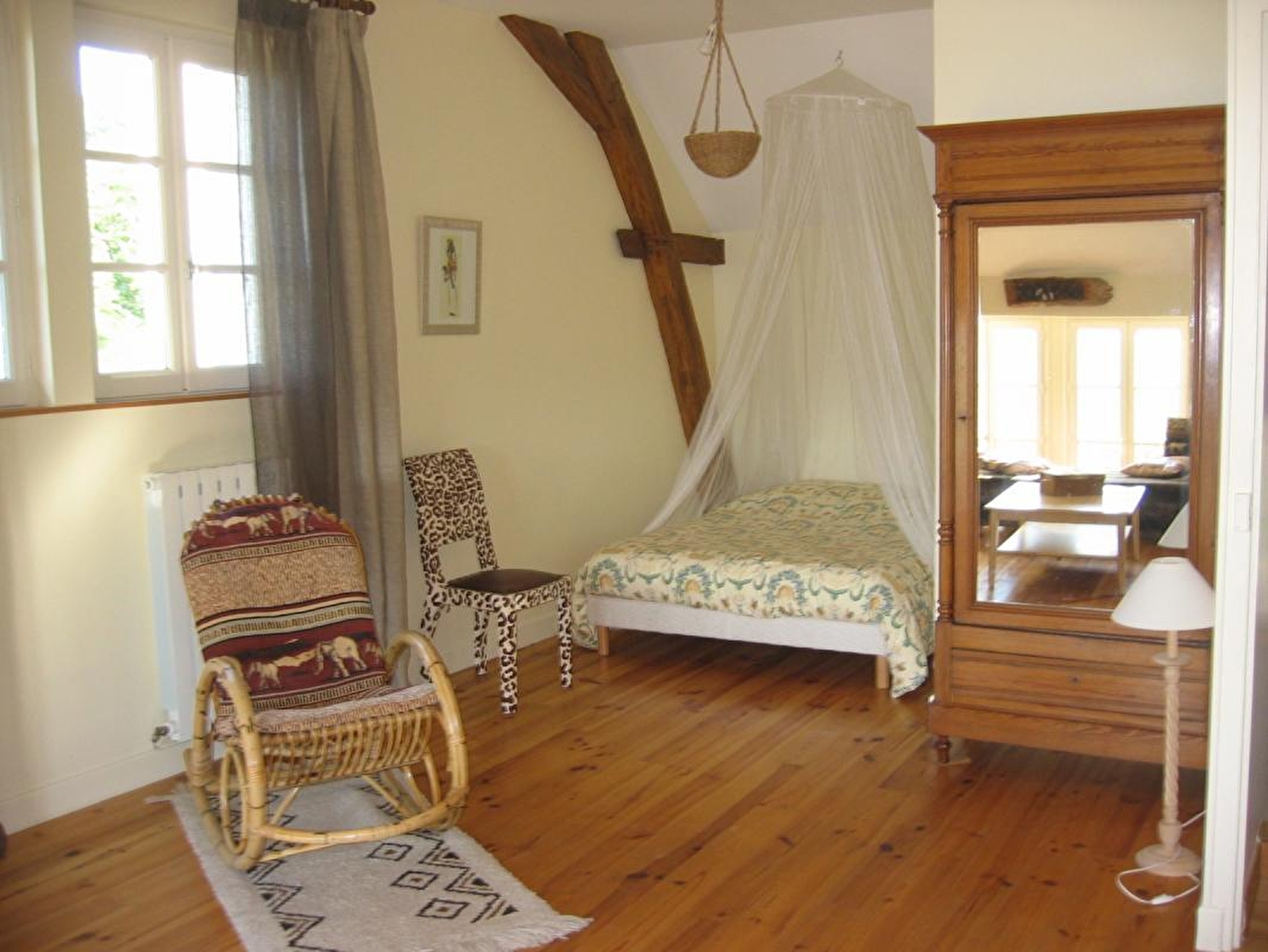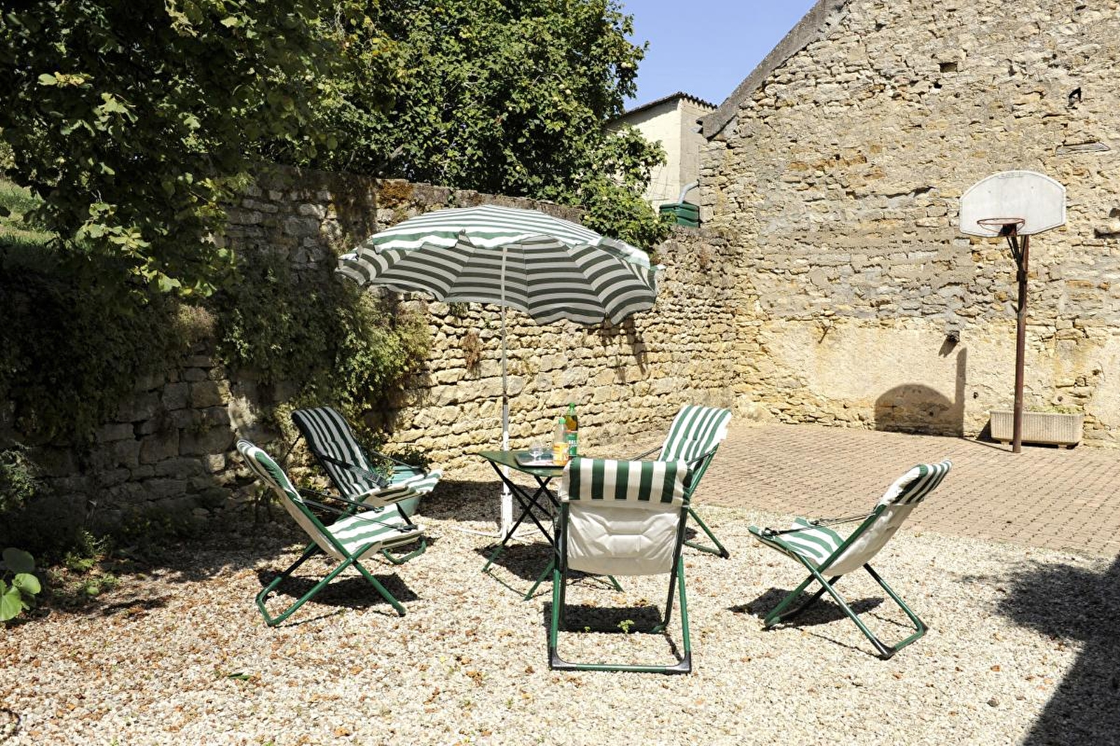 Composition : Maison de village mitoyenne jouxtant résidence secondaire propriétaires (indépendance totale). Wifi (fibre). Chauffage central fioul. Rdc : séjour-cuisine-salon, salon TV, salle d'eau (douche). Rdc surélevé : Wc indépendant. 1er étage : 4 chambres (3 avec 1 lit 2 p. 140x190cm / 2 lits 1 p. 90x190cm), sdb (baignoire + douche), Wc indépendant. Cour-terrasse + local vélos privés. Jardin commun (5000m²). Parking public sur rue. Commodités & supermarché 3 km.