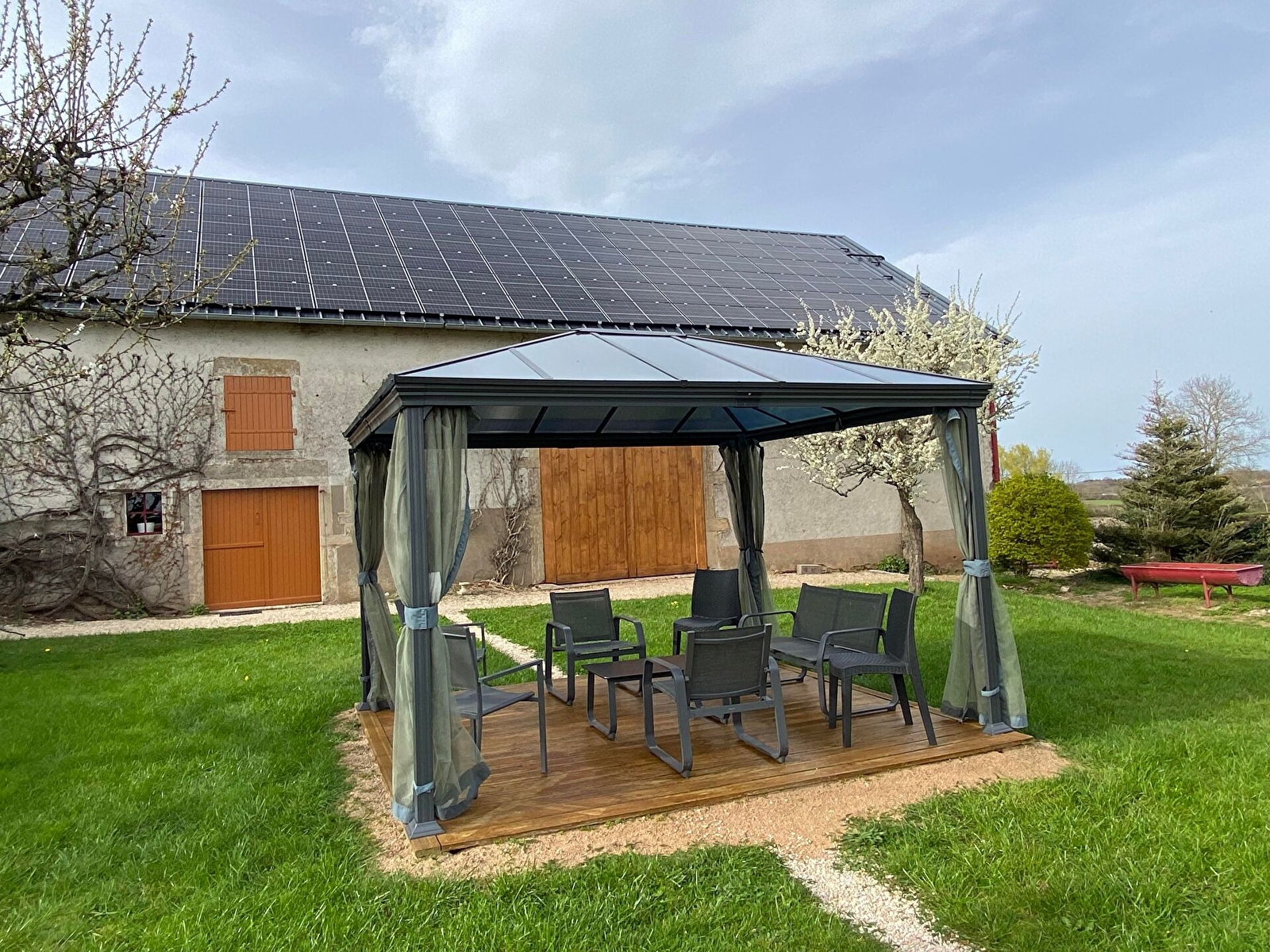 Installation d'une toiture photovoltaïque de 36kwc , permettant l'autonomie du gîte et d'alimenter en électricité 10 maisons supplémentaires. Création d'une fontaine à cascades lumineuses la nuit. Pour les bambins, jolie petite roulotte fabriquée par nos soins. Enfin la pergola avec moustiquaire au centre de la pelouse sur la terrasse , pour prendre l’apéritif où se détendre.