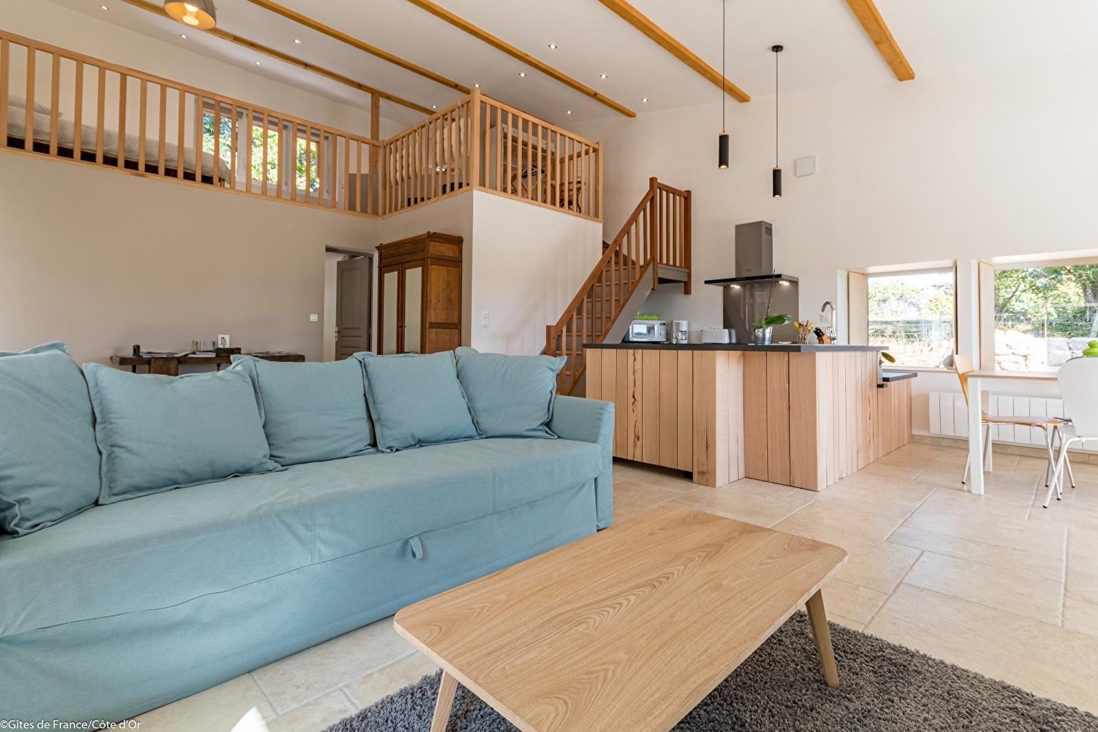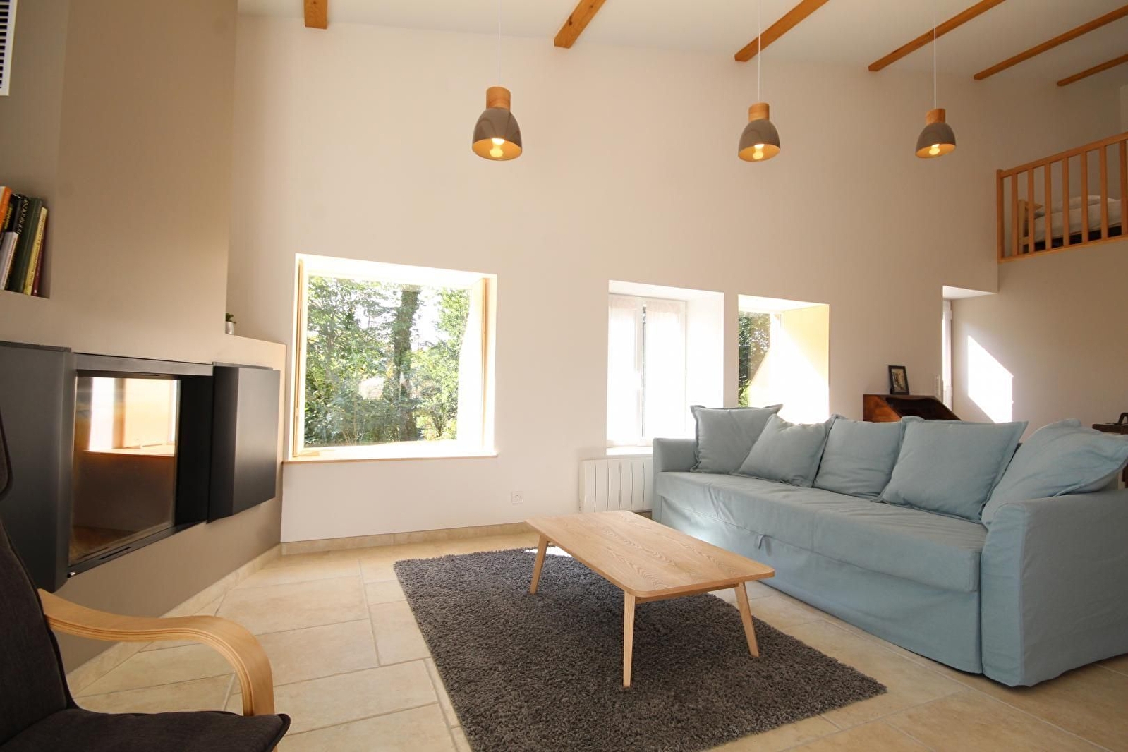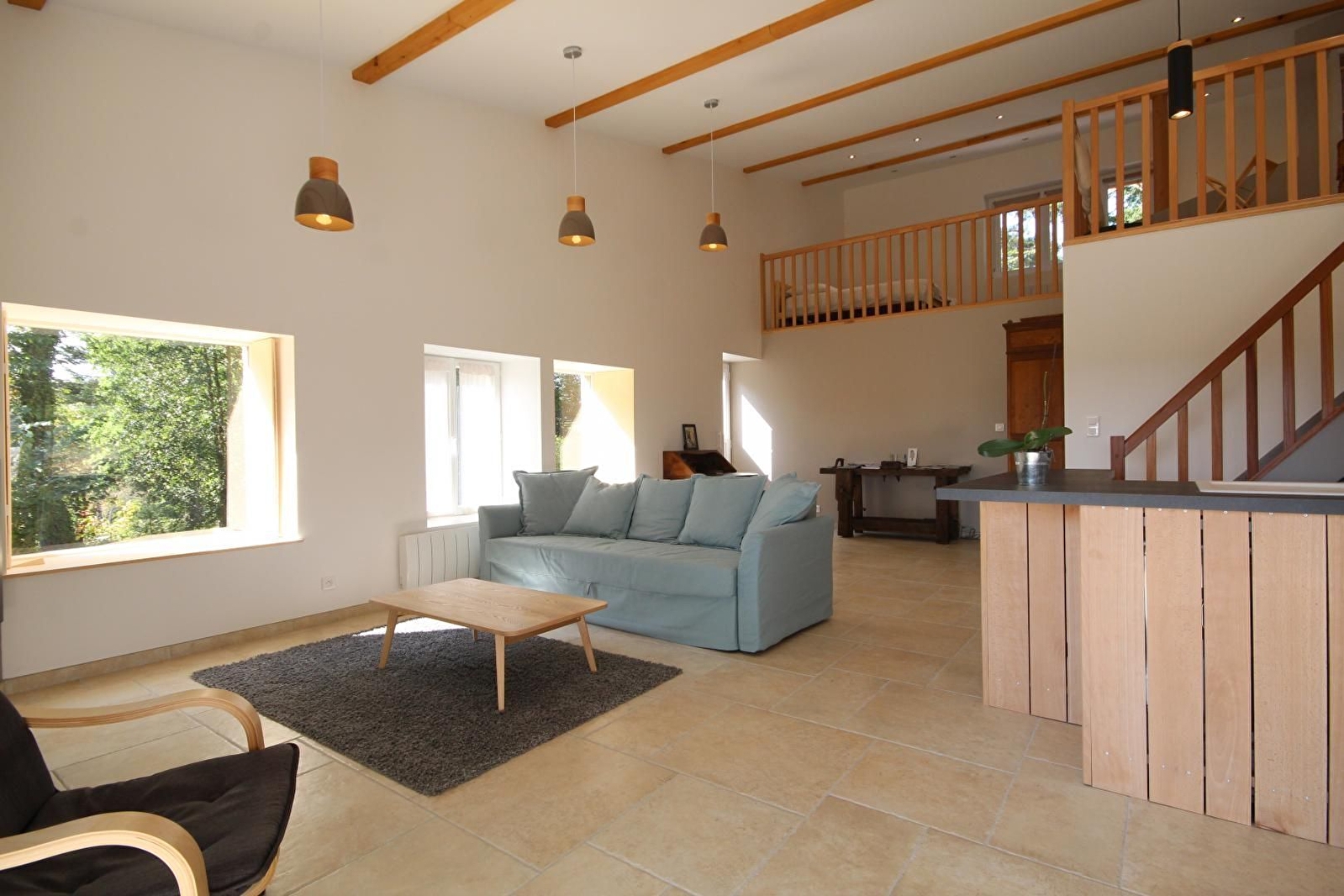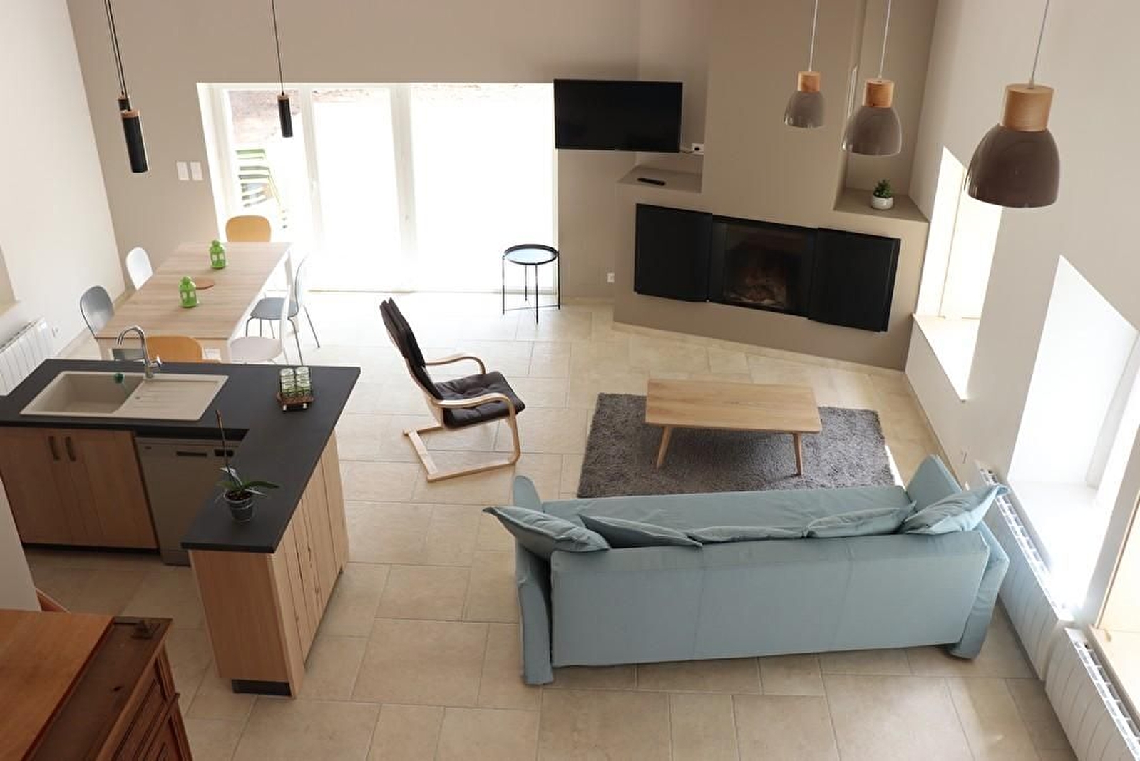 Rez-de-chaussée : grand séjour lumineux et ouvert sur le jardin, avec cuisine équipée, salon avec cheminée insert et espace salle à manger. Une chambre avec un lit 160. Salle d'eau avec douche à l'italienne et WC. 2ème chambre en mezzanine à l'étage avec 2 lits 90 jumelables et sanitaires dans la chambre (baignoire, lavabo et WC).