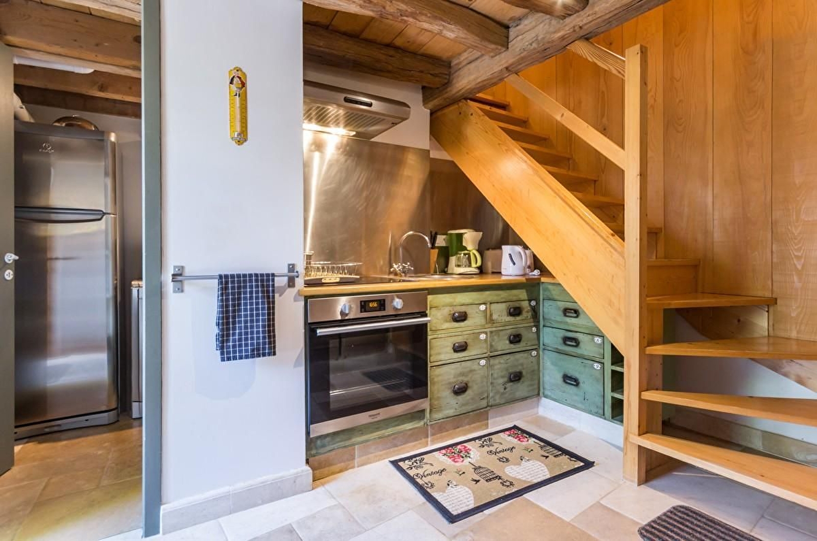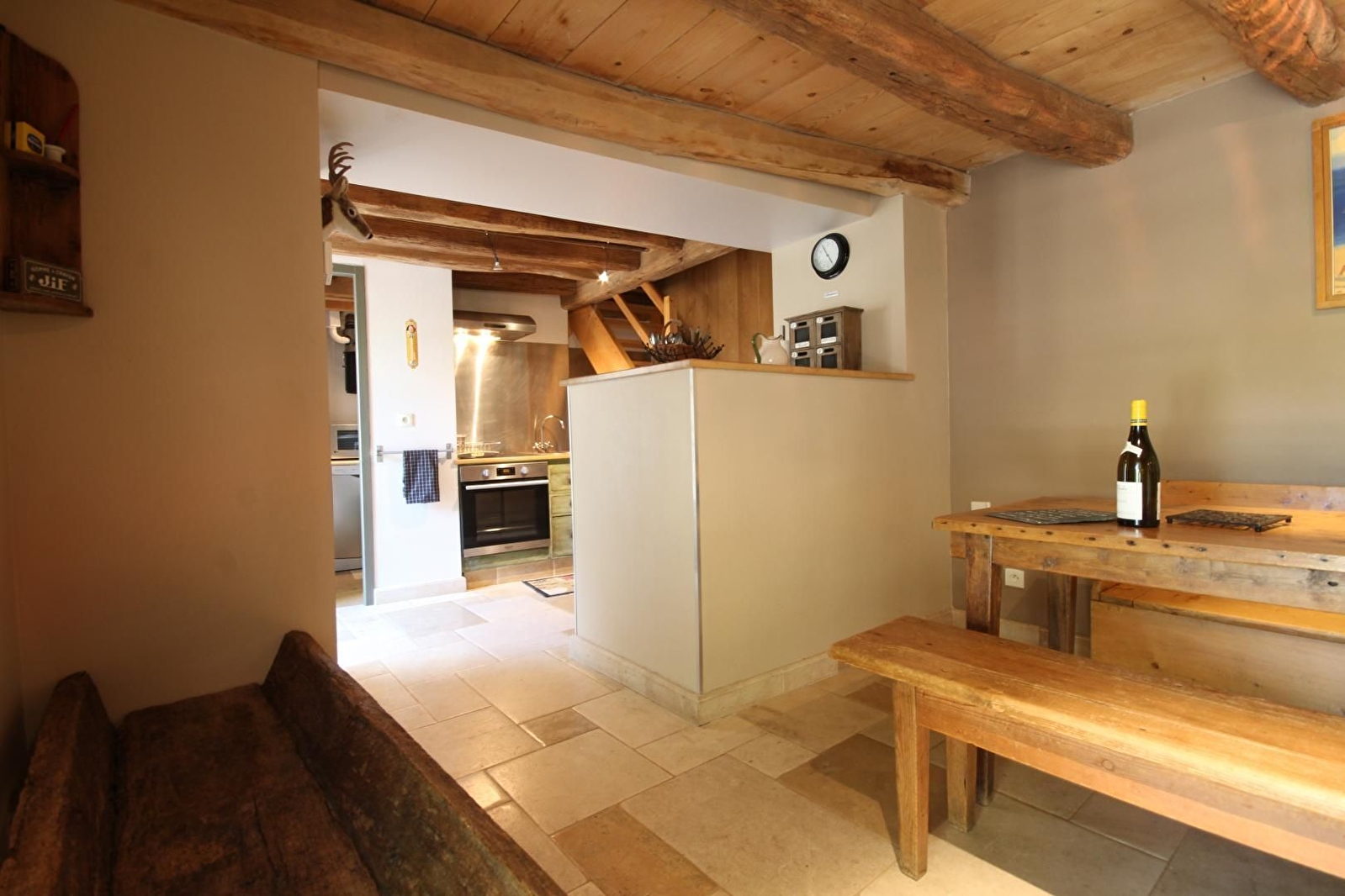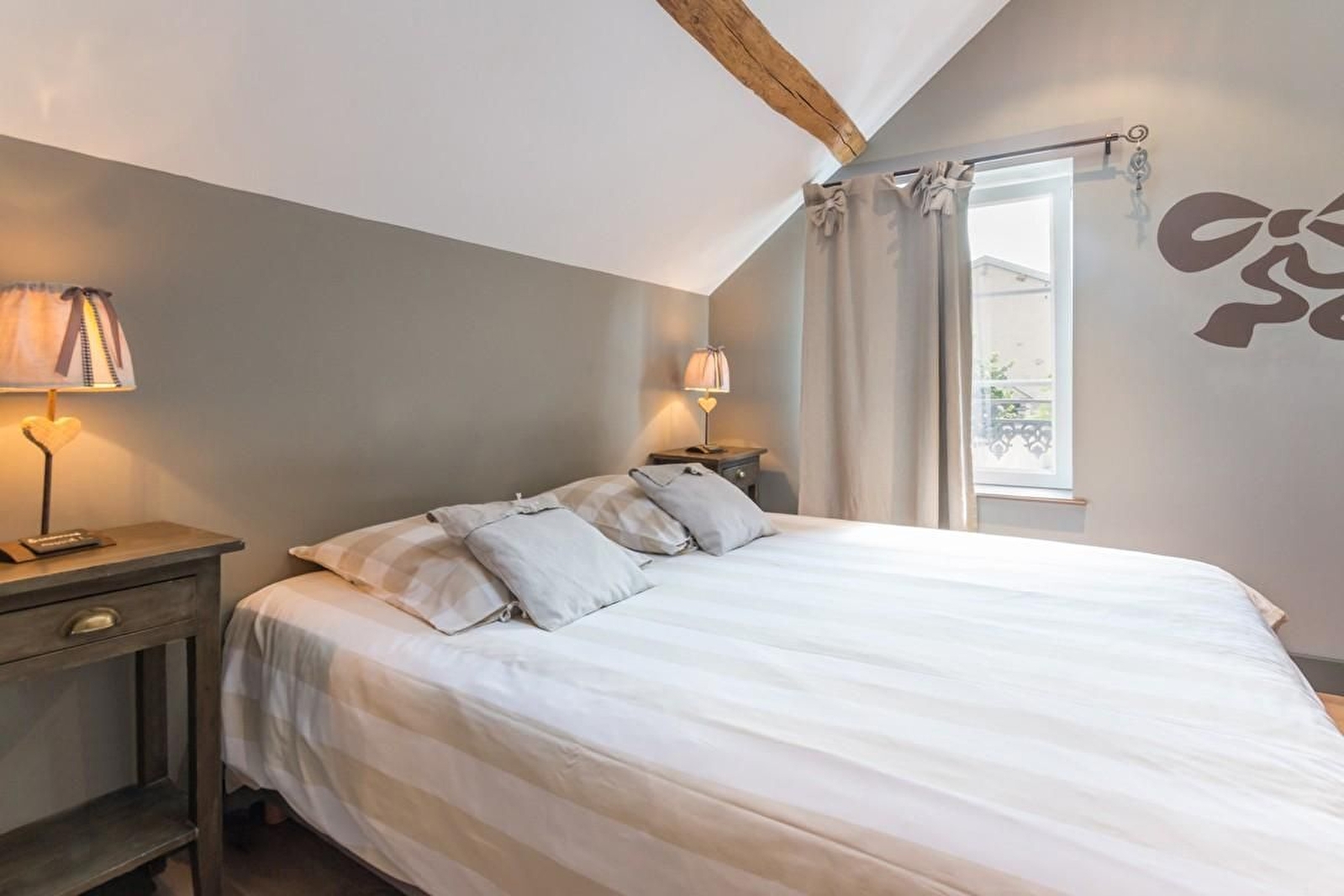 Rez-de-chaussée : cuisine ouverte sur salle à manger, salon avec poutres, dalles au sol. Cellier. 1er étage : 1 chambre avec salle d'eau privative et WC indépendant. 2 chambres communicantes avec salle d'eau et WC privatifs. Les chambres sont équipées de 2 lits de 80 cm jumelables en lits 160.