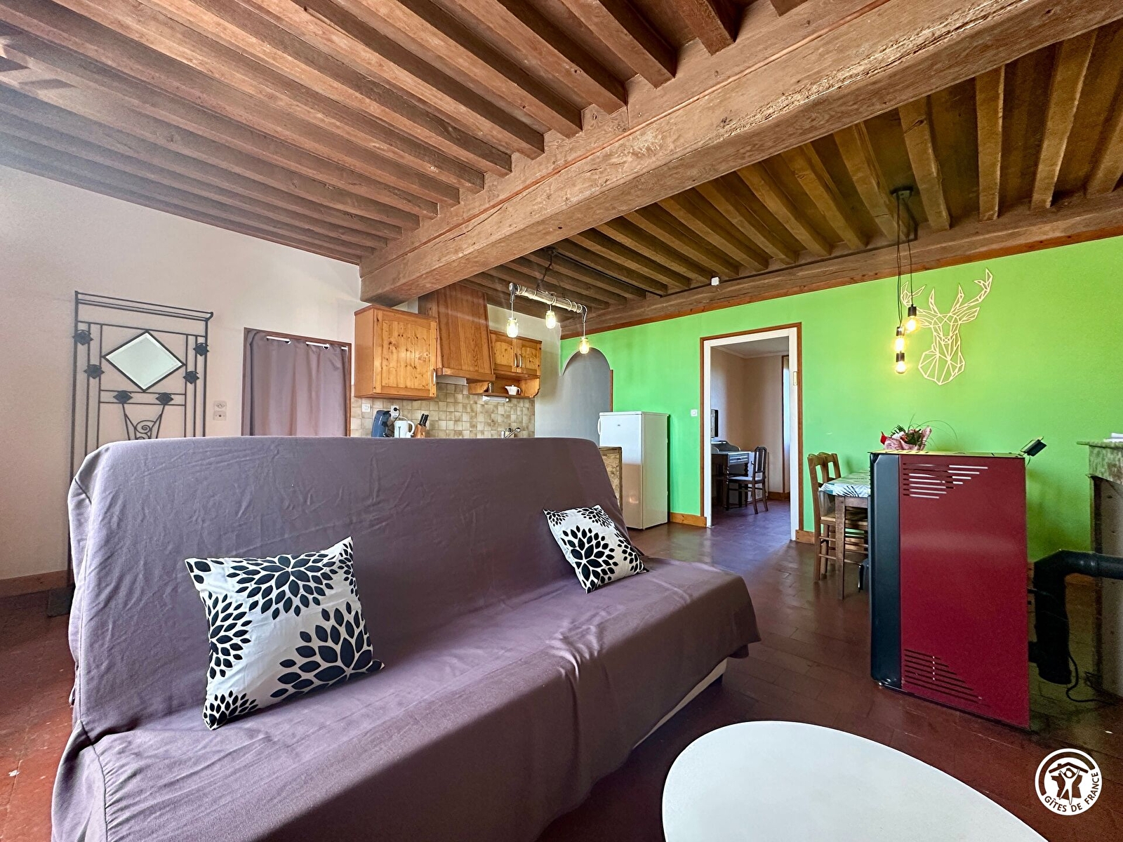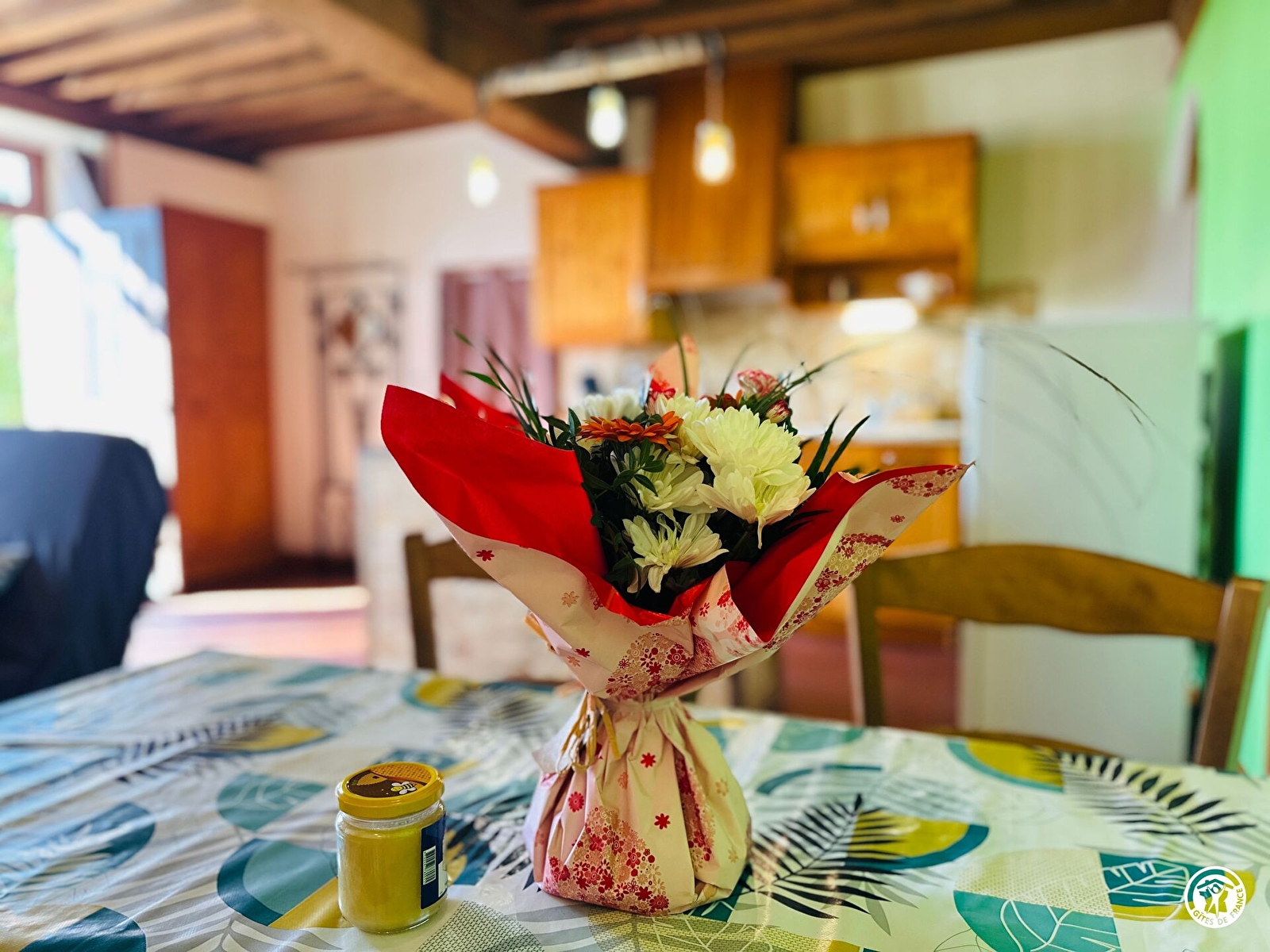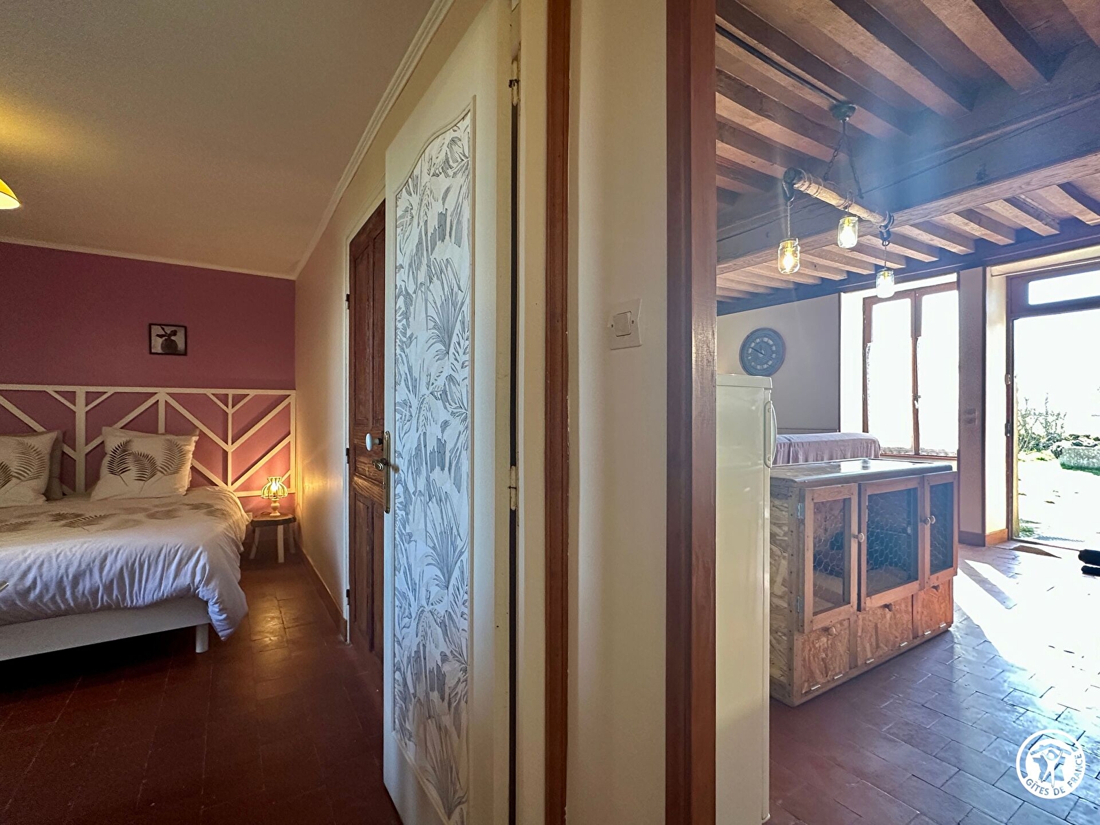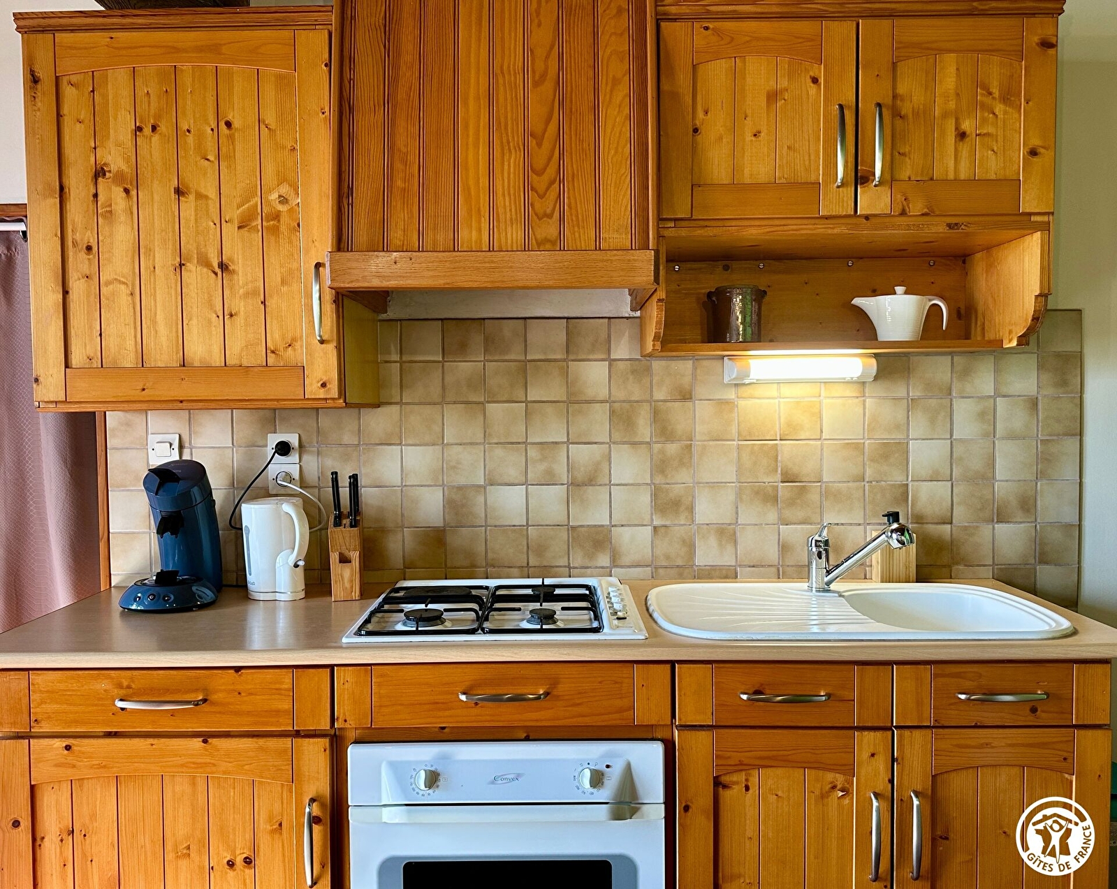 Gîte confortable de 50m2 pour 2 à 4 personnes, mitoyen à un futur gîte. Grand jardin clos commun avec une partie privative aménagée d'un salon de jardin et d'un barbecue charbon. Coquette pièce de vie avec coin cuisine : plaques de cuisson (3 feux gaz et une plaque électrique), micro-ondes, four électrique et réfrigérateur), coin déjeuner et espace salon avec TV écran plat et poêle à pellets (pellets fournis dans la limite d'une consommation raisonnable), canapé type clic clac pour 2 personnes (140cm), documentation touristique et jeux de société Chambre 2 personnes dotée de 2 lits 90x190cm jumelables. 3 marches mènent à la salle d'eau avec WC (machine à laver).