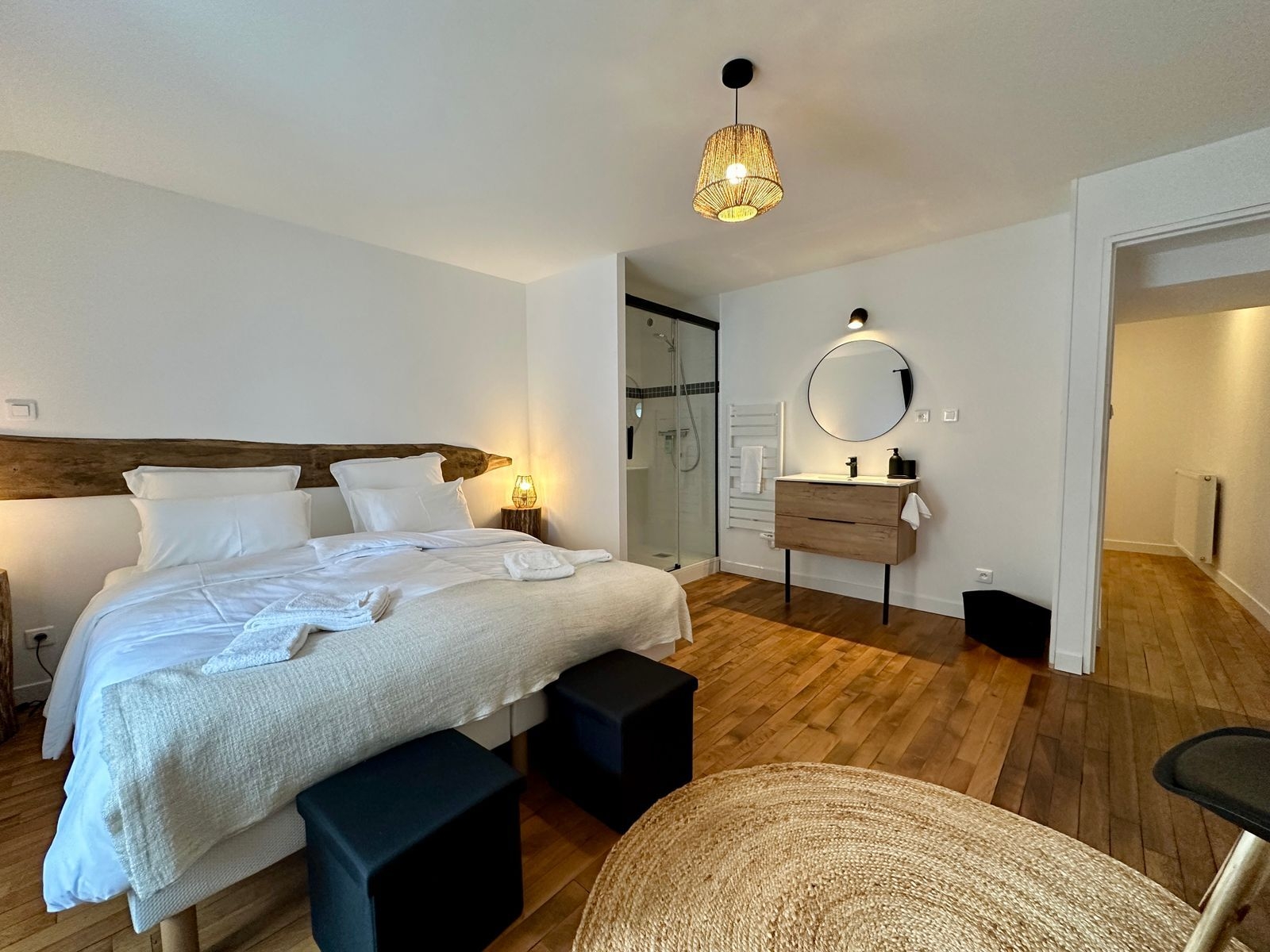 Au rez-de-chaussée, vous trouverez une grande cuisine moderne et fonctionnelle, une buanderie équipée (lave-linge, sèche-linge), de nombreux rangements et un WC indépendant. Quelques marches mènent à une belle pièce de vie très lumineuse grâce à une large baie vitrée donnant accès à la terrasse et au jardin clos, avec mobilier de jardin et barbecue. Coin repas, salon avec poêle à bois (bois fourni), poutres et pierres apparentes complètent l’ensemble.