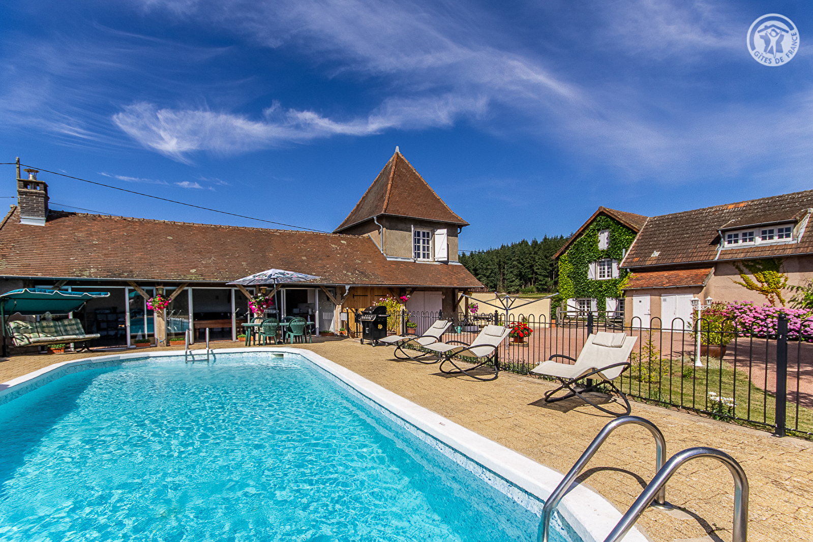 Confortable et ravissante demeure, nichée en pleine campagne, au creux d'un agréable cadre naturel et champêtre préservé de prairies & vastes forêts, au sein d'un hameau résidentiel calme. Vaste parc paysagé très soigné de 7000 m², engazonné, végétalisé et fleuri disposant d'un niveau d'équipements de loisirs littéralement exceptionnel : belle piscine chauffée (5x10m / disponible uniquement de début mai à fin septembre, pouvant être partagée occasionnellement avec les propriétaires) avec large terrasse & pool-house ultra-équipé (cuisine d'été complète, nombreux jeux de société, chaine-hifi, billard, babyfoot, piano exclusivement réservé aux mélomanes , jeu de fléchettes, "coin sieste" avec lit 1 personne), cours de tennis, table de ping-pong, grande cour en gravier (terrain de pétanque naturel !) & plusieurs espaces ludiques de détente ( balançoires, potager...). Spacieux gîte de bon confort. Ambiance douce & cosy. Agréable terrasse couverte accessible depuis la cuisine complétée par un balcon-terrasse à l'étage accessible depuis le salon, avec vue imprenable sur le parc. Superbes paysages et panorama. Parking privé en bas de la propriété.