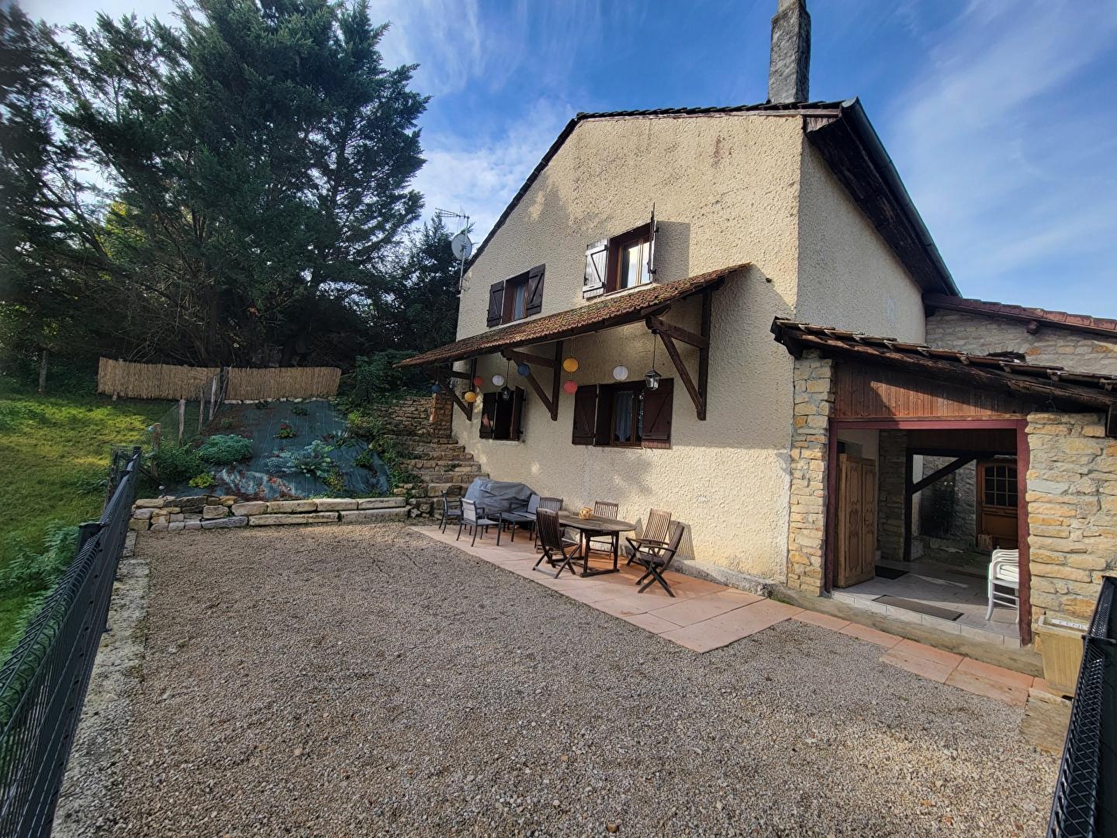 Atypique demeure "seventies" pétrie d'histoire locale & familiale, authentique ancienne - très rare - discothèque de campagne réputée ayant connu son heure de gloire dans les années 80 (édifiée en 1979 puis gérée par le papa de Laure), blottie sur une mini colline en lisière d'une bucolique pâture boisée accueillant "Chaussette" & "Blanquette" les paisibles moutons des propriétaires. En pleine verdoyante campagne bressane, au cœur d'un petit hameau rural résidentiel niché à deux pas des rives de la Seille, remarquable écosystème appréciée des pêcheurs comme des amoureux de la nature protégé en "Zone Natura 2000" comme en ZNIEFF pour ses richesses faunistiques & floristique (réserve d'oiseaux migrateurs, espèces végétales rares, nombreux poissons dont les célèbres silures, animaux & faune sauvage…). Apaisante campagne vallonnée alentour préservée, conjuguant douces prairies parsemées d'étangs & rivières et belles forêts sauvages. Gîte de très bon confort. Exceptionnelle pièce de vie de 100m² lovée à l'endroit de l'ancienne piste de dance & son bar. Chaleureux cachet campagnard aux accents contemporains, inspiré des bâtisses bressanes traditionnelles (aménagement soigné avec d'authentiques poutres, pierres, linteaux en bois, manteaux de cheminée en pierre... de pays). Beaucoup de charme. Ambiance cosy & douillette mixant traditions & modernité. Intimiste terrasse en partie abritée dominant un agréable jardin naturel clos (600m²) & la clairière environnante.
