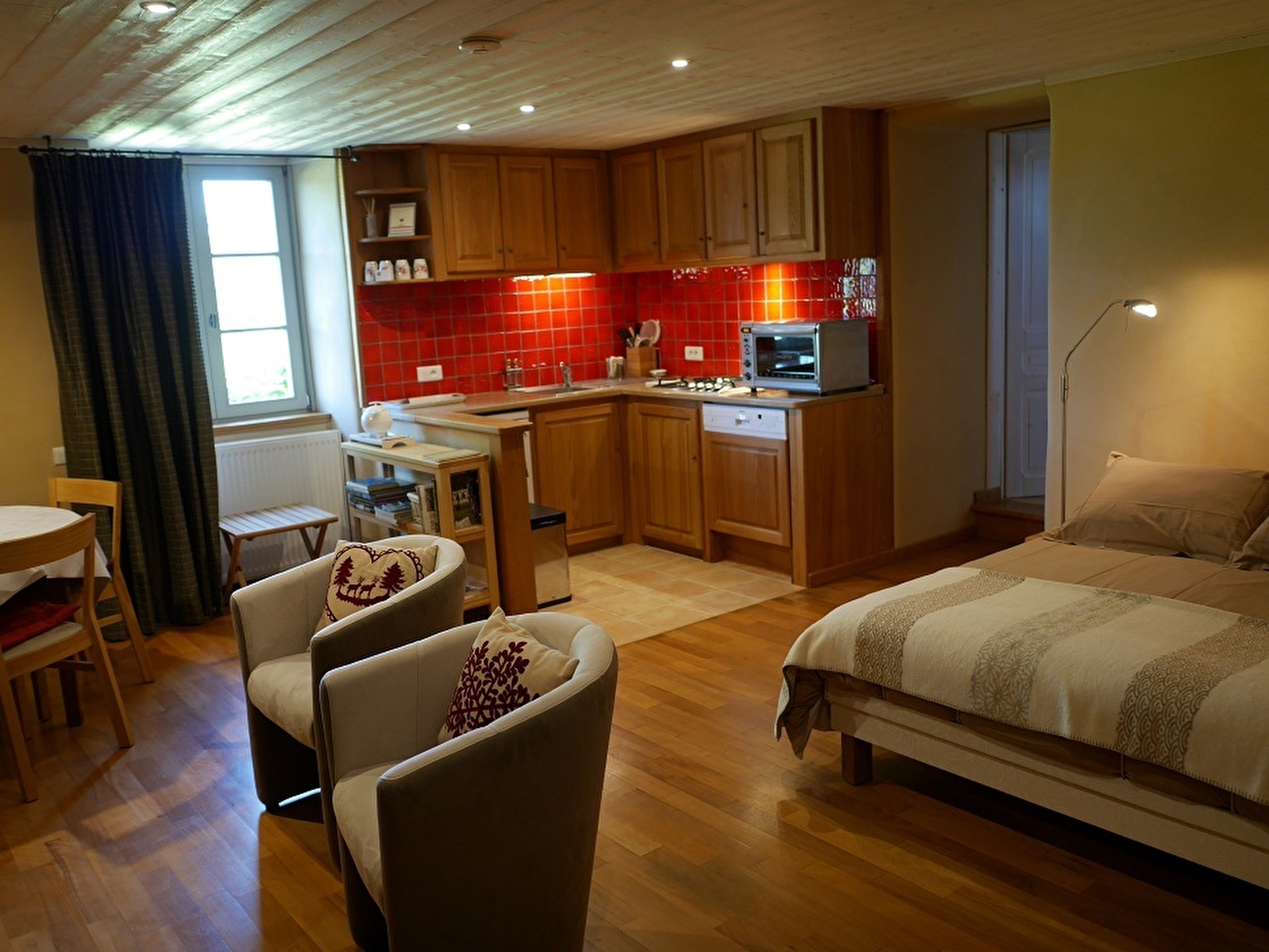 Charmant studio dans une partie d'une ancienne ferme comtoise restaurée. Situé dans un hameau sur le premier plateau du Jura, dans la vallée de l'Angillon et à proximité de la Route des Sapins. Les propriétaires ont souhaité valoriser cette belle ferme comtoise par une "éco-restauration" avec des matériaux sains et écologiques, dans le respect du bâti ancien. Ils auront à cœur de vous accueillir et de vous faire découvrir leur environnement, à deux pas de la région des Lacs, pour un séjour nature, sportif ou reposant. Cet hébergement se compose d'un hall d'entrée, pièce à vivre de type studio avec cuisine ouverte sur coin salon, salle à manger (équipée d'un poêle à bois) et espace couchage avec 1 lit en 140x200. Salle d'eau avec douche, wc indépendants. Terrasse attenante orientée sud-ouest avec salon de jardin. Tarif toutes charges comprises. Draps, linges de toilette, linge de maison fournis. Abri moto et local vélo à disposition. Possibilité de louer un autre gîte pour 2 personnes situé dans la même bâtisse : gîte l'Angillon. Tarif spécial curiste sur demande auprès des propriétaires.