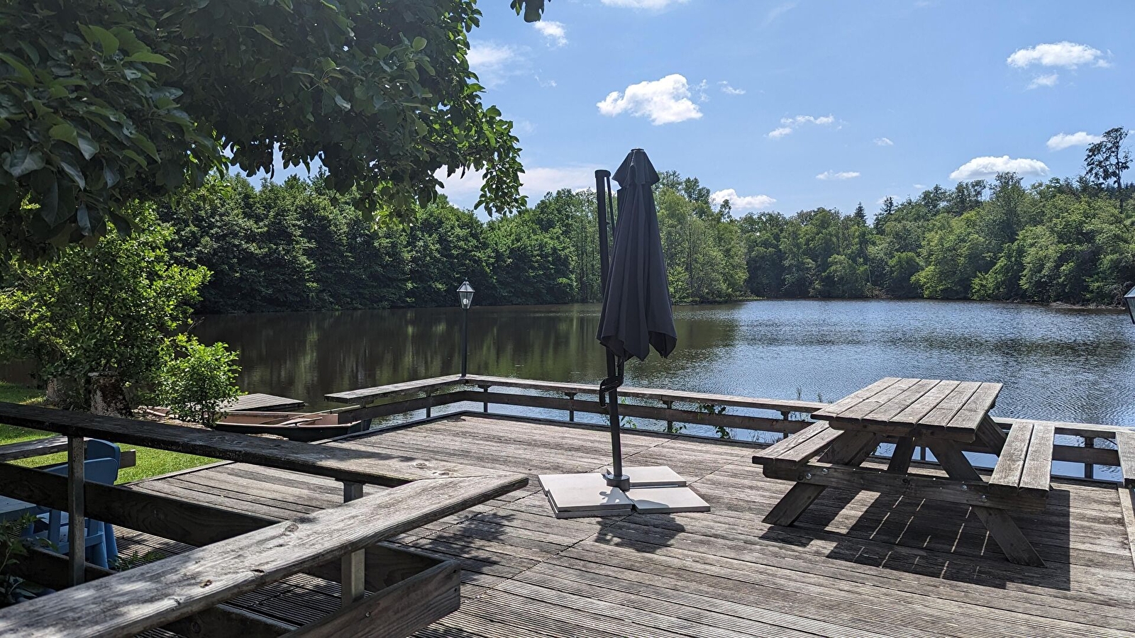 Terrain commun aux 2 gîtes de 9 hectares avec cour, parking, espaces verts et accès aux abords de l'étang. Terrasse privative sur l'étang. Pêche no kill autorisée avec prêt d'une barque. 1 animal maximum avec supplément de 20€ par jour.