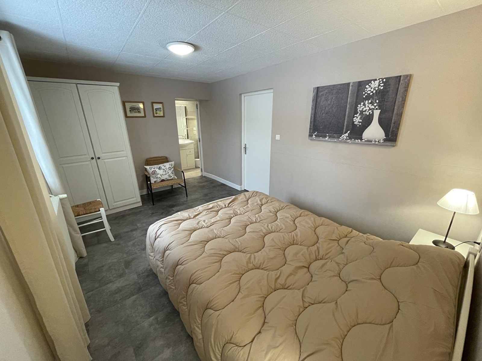 Logement indépendant au RDC de la maison des propriétaires avec sa propre entrée et un hall d'entrée. Cuisine- séjour, ch1: 1 lit 2 pl, 1 lit 1 pl avec cabinet de toilette (wc et lavabo), ch2: 1 lit 2 pl (chambres en enfilade). Salle d'eau et wc. Terrain attenant non clos, cour, salon de jardin. Chauffage central. Accès wifi. Toutes charges comprises.