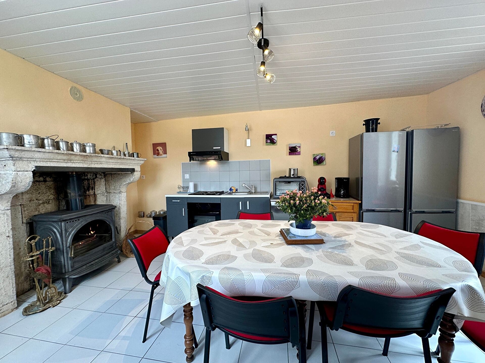 En RDC : une cuisine toute équipée avec poêle à bois offrant une vue sur la campagne, un salon (TV écran plat) avec pierres apparentes et plafond à la française.