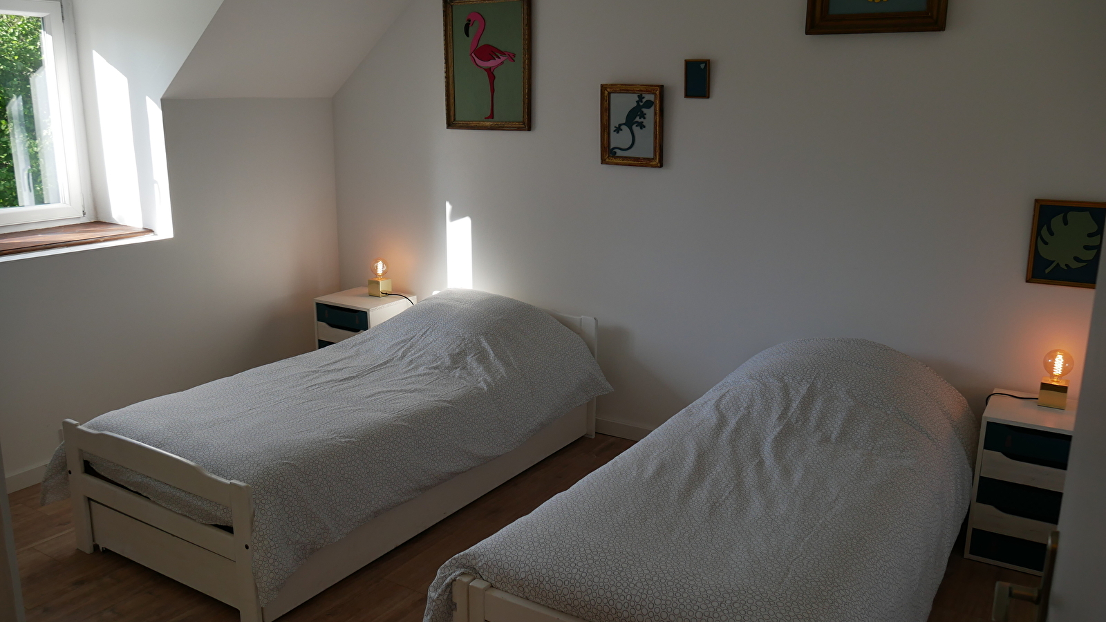 A noter : il y a deux entrées séparées : une pour les pièces à vivre (salon, salle à manger, cuisine) et une pour les chambres et la salle de bain. Il y a un pas à faire à l'extérieur entre les deux espaces.