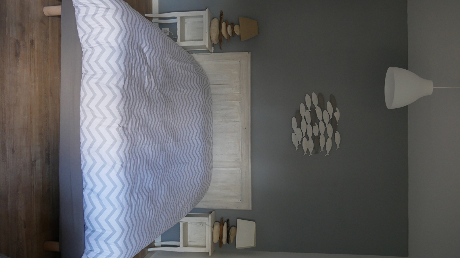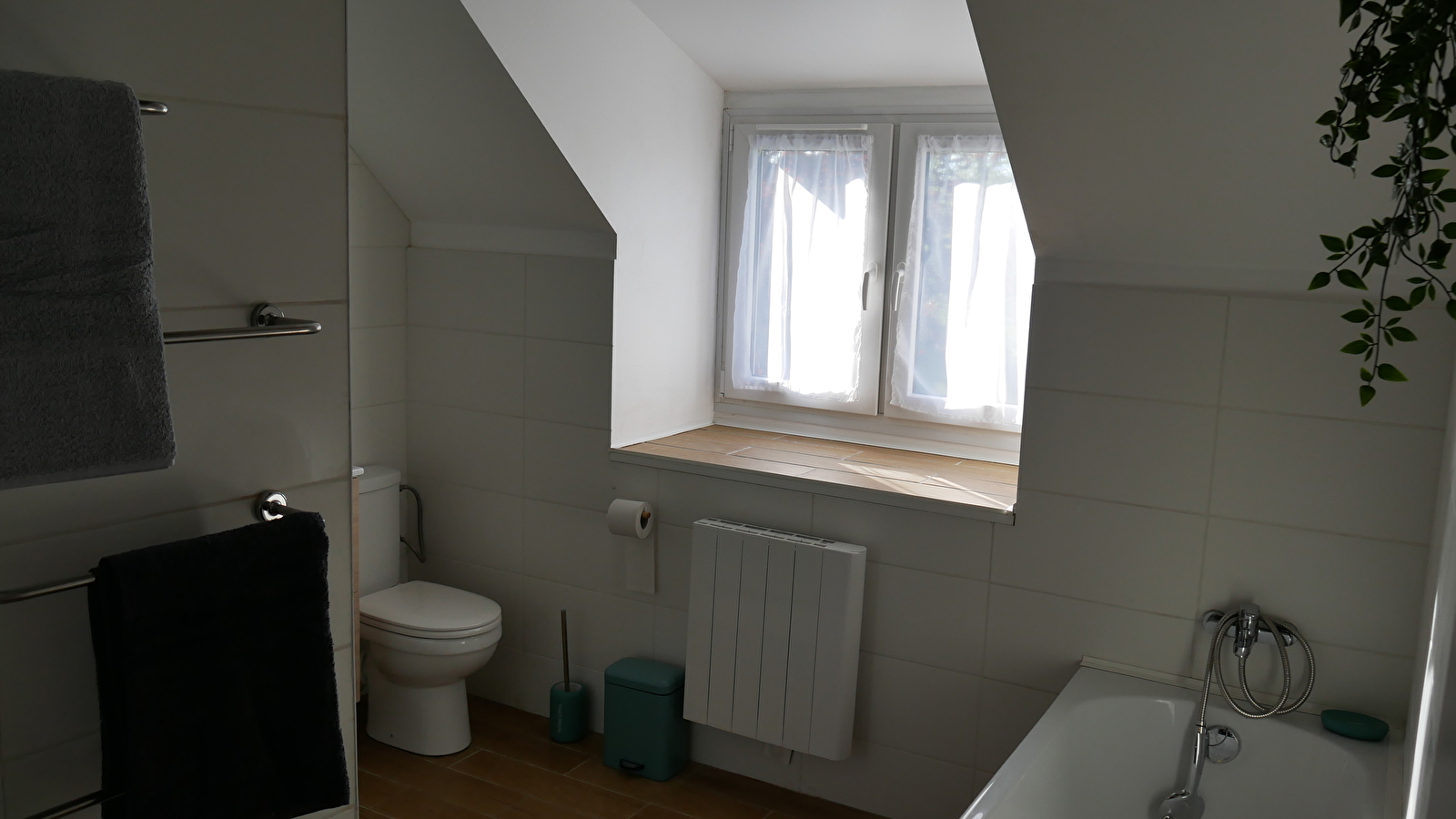 A l'étage: 3 chambres et une salle de bains, avec douche et baignoire.