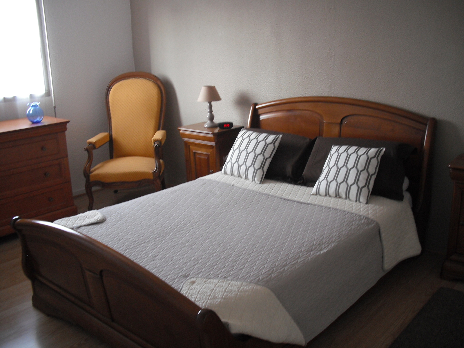 == Chambre avec lit double, commode et vaste armoire-penderie.