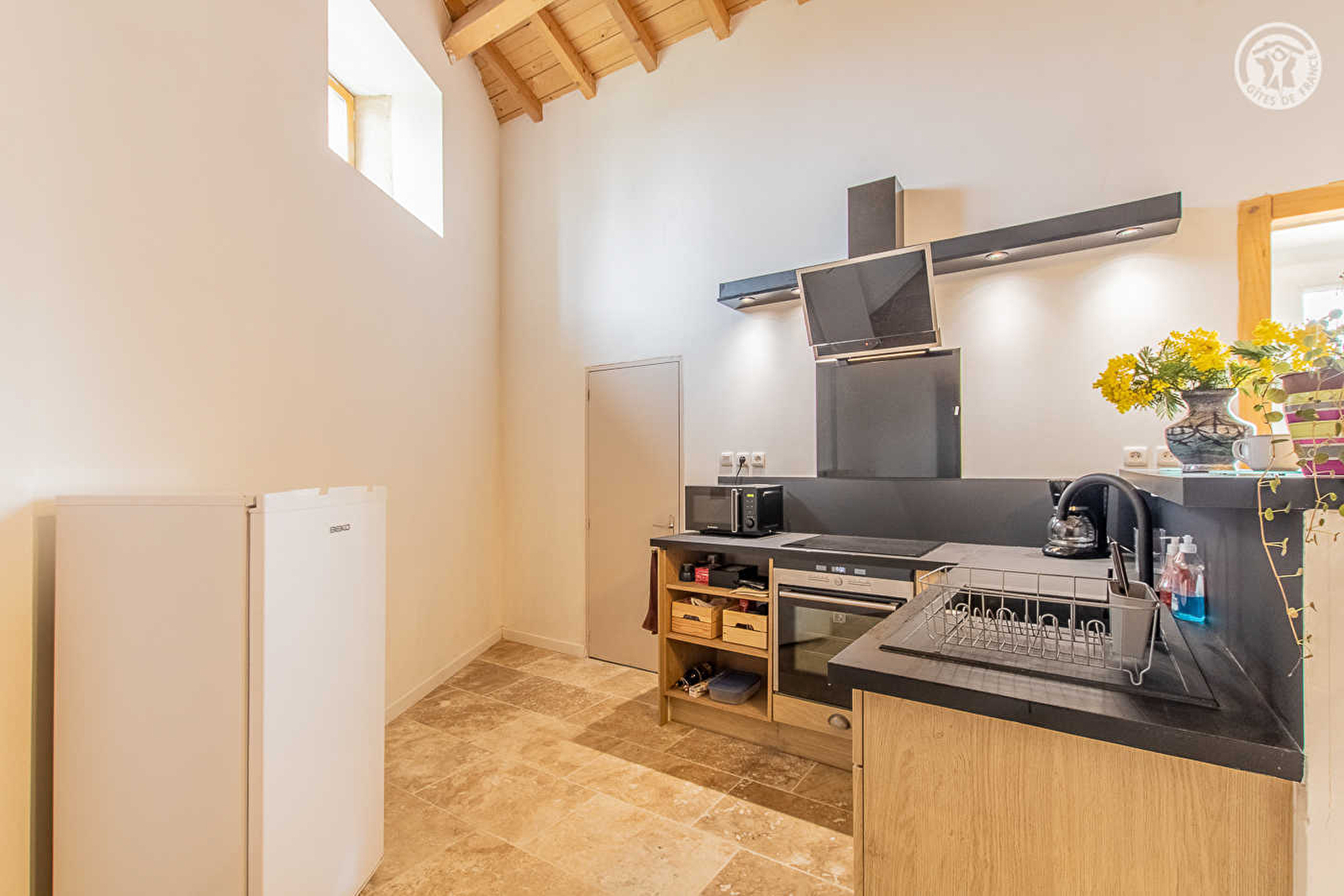 Composition : Maison individuelle (accès par mini chemin de terre carrossable sur 30m). Wifi (fibre). Poêle à granulés bois + chauffage électrique. Rdc : séjour-cuisine-salon, 1 chambre (lit 2 p. 140x190cm), salle d'eau (douche/Wc), buanderie. 1er étage : chambre en mezzanine (2 lits 1 p. 90x190cm). Terrasse couverte + terrasse + jardin (1800m²) + local vélos + parking privés. Commodités dont supermarchés à 3 km.