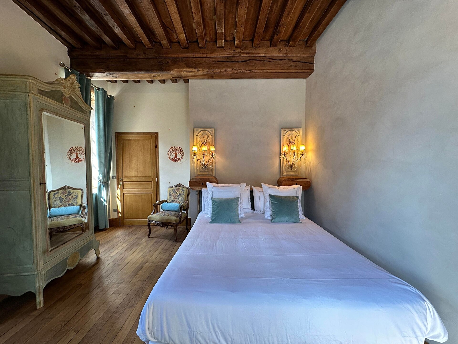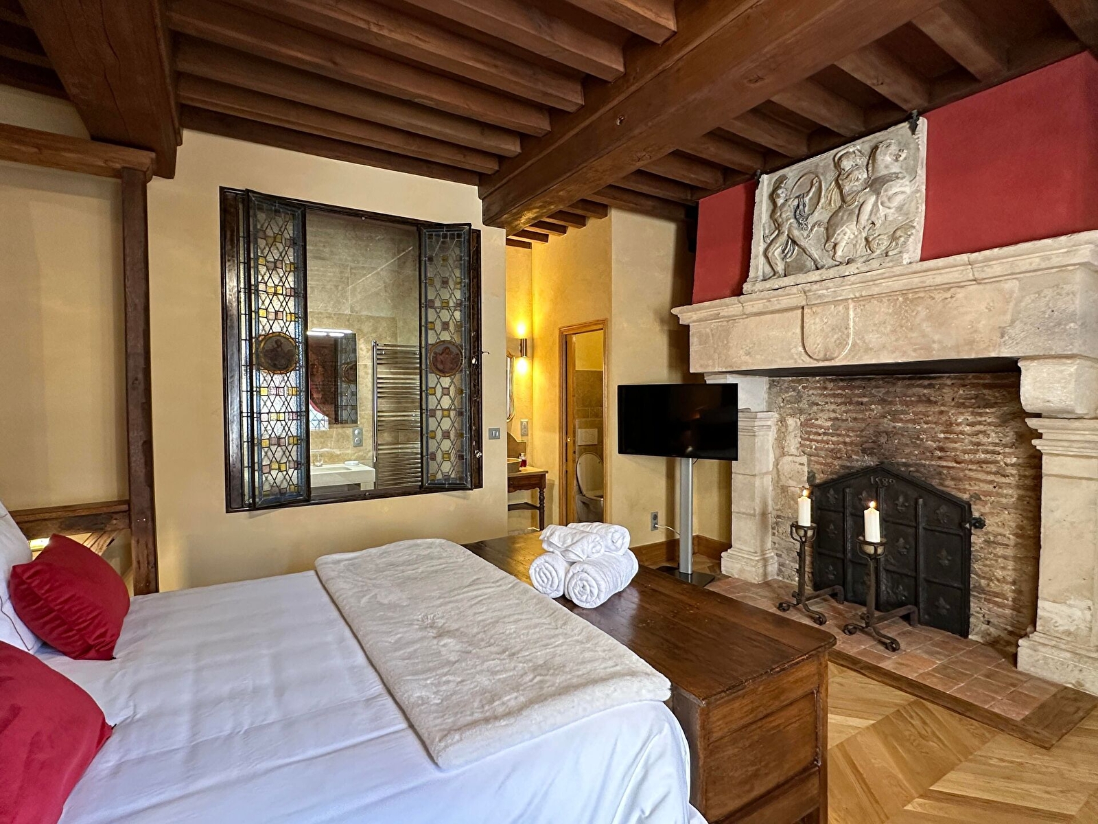 Les têtes de lit sur mesure en chêne massif, les importantes cheminées ornementales, les vitraux, etc… et le respect des matériaux nobles comme le bois, la pierre de Bourgogne ou encore les tomettes rendent chaque chambre unique.