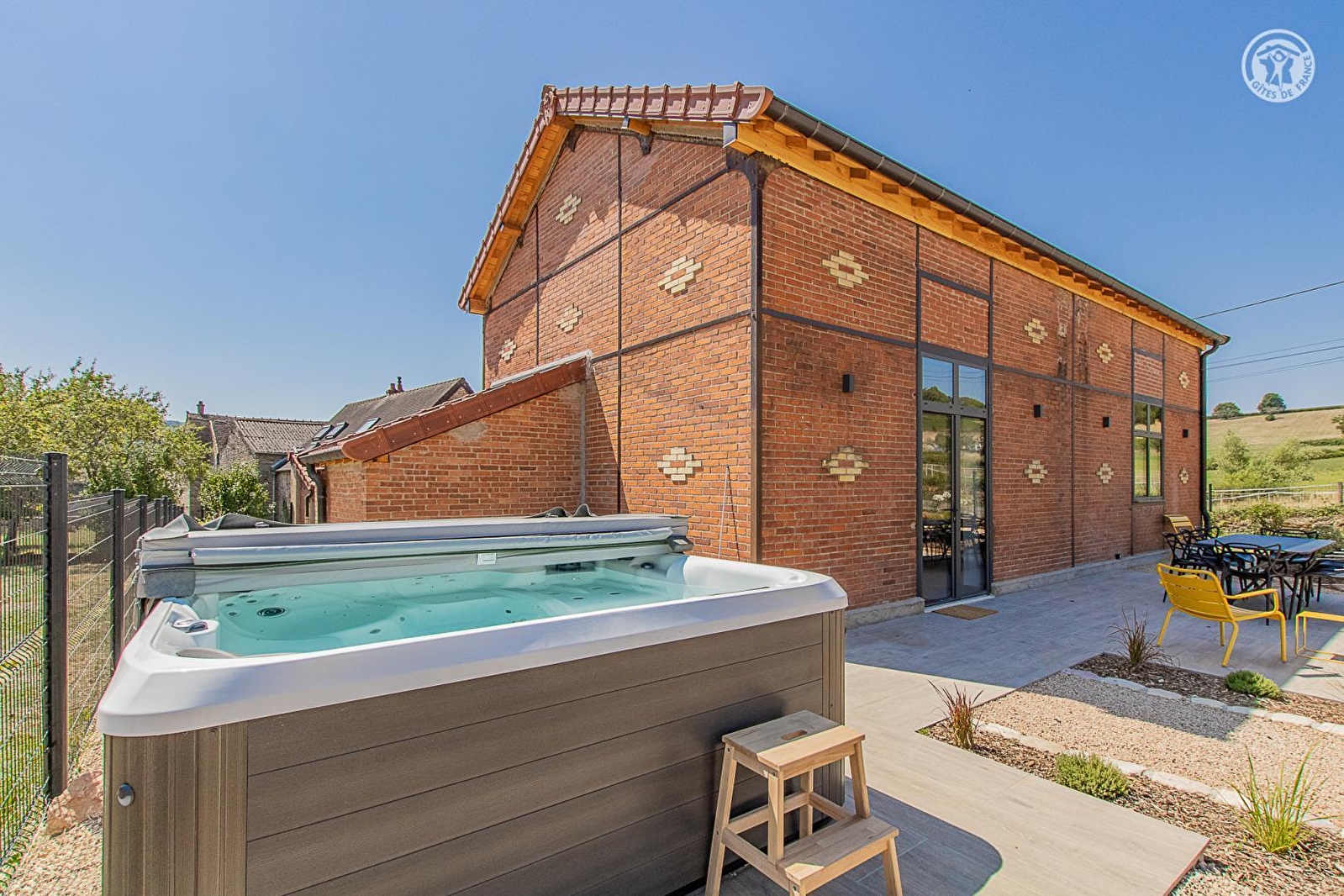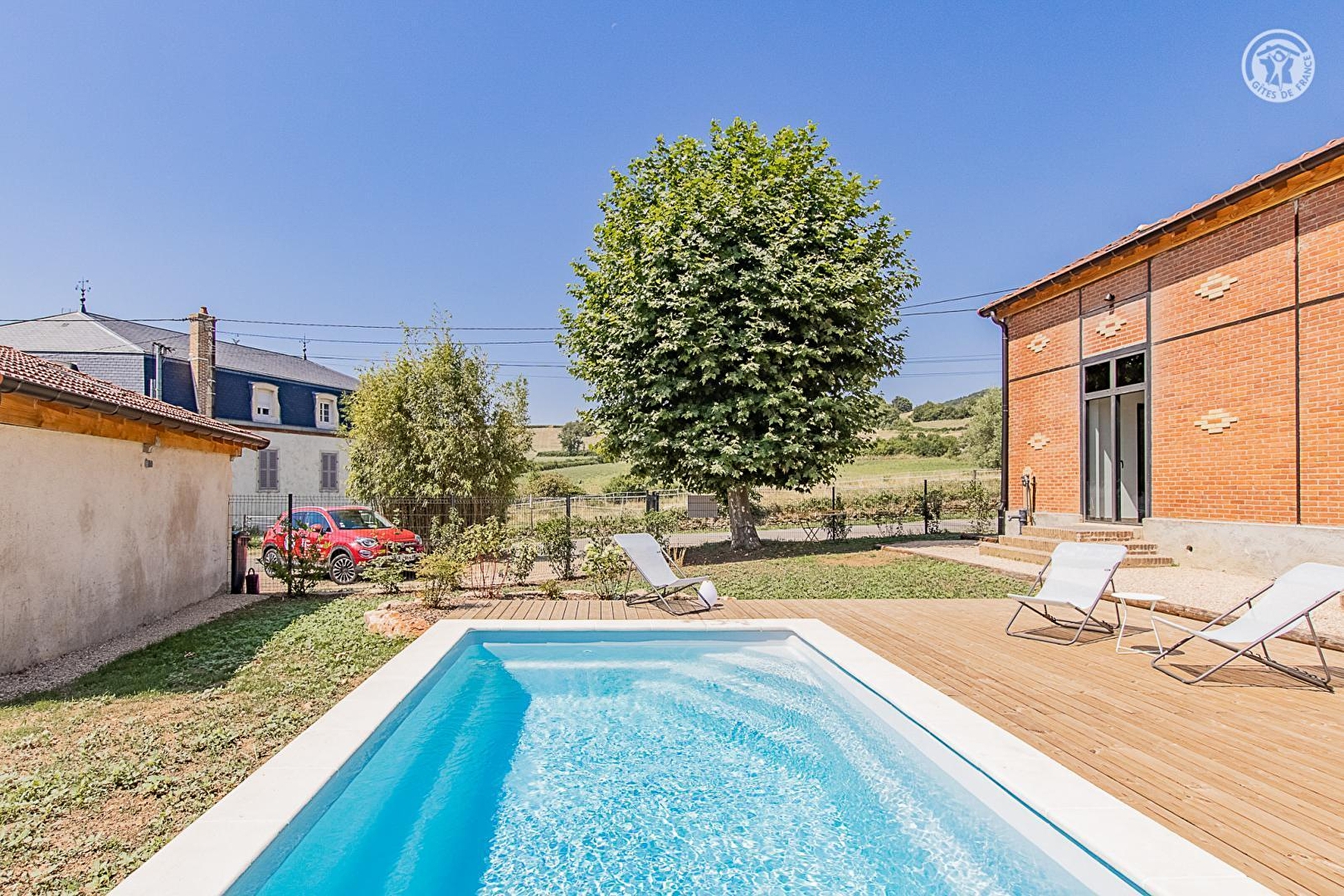 Authentique ancienne "école de filles du village" de la fin du XIXe - bâti de caractère chargé d'histoire doté d'une insolite élégante architecture en briques - soigneusement revisitée avec goût & dans les règles de l'art en confortable villégiature de charme, niché au calme en lisière de prairies face aux vignobles (sis à 200m) au sein d'un paisible pittoresque village viticole de la Côte Chalonnaise. Doté d'une église romane classée du XIe, lové autour d'une dépaysante place de village de carte postale & traversé par une bucolique petite rivière poissonneuse, ce bourg vivant & commerçant profite d'un magnifique cadre paysagé vallonné de coteaux de vignobles & douces prairies, blotti au pied des collines boisées de vastes massifs forestiers (nombreuses balades en pleine nature & exceptionnels belvédères panoramiques) au creux de la sublime "Vallée des Vaux". Spacieux gîte de grand confort. Pièce de vie de 60m². Équipement complet de grande qualité. Chaleureux cachet contemporain raffiné & cossu. Ambiance douillette & ultra cosy. Énormément de charme. Agréable terrain clos de 800m² parfaitement aménagé, comprenant : jardinet, vaste double terrasse (est & ouest / très beaux couchers de soleil), piscine chauffée (5x3m avec douche), spa (6 places), terrain de pétanque & table de ping-pong. Belle vue sur les vignobles environnants.