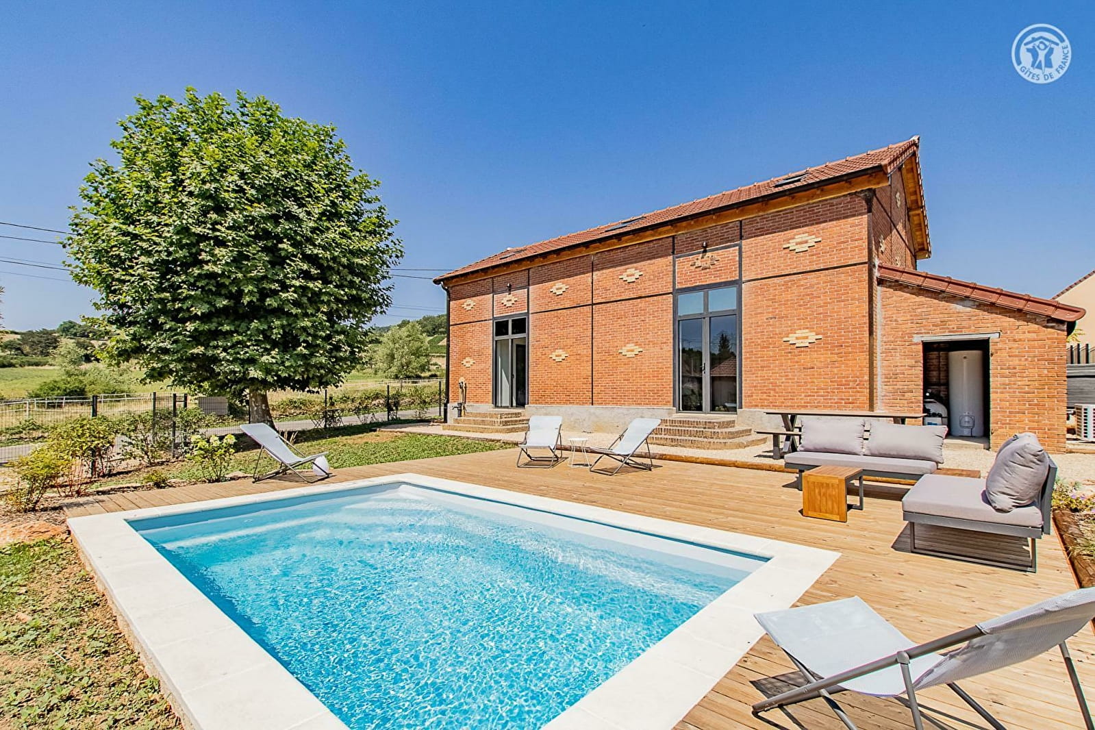 Authentique ancienne "école de filles du village" datant de la fin du XIXe - bâti de caractère chargé d'histoire doté d'une insolite élégante architecture en briques - intégralement restaurée dans les règles de l'art et soigneusement revisitée avec goût en confortable villégiature de charme, niché au calme en lisière de prairies face aux vignobles (sis à 200m) au sein d'un paisible pittoresque village viticole de la Côte Chalonnaise. Doté d'une église romane classée du XIe, lové autour d'une dépaysante place de village de carte postale & traversé par une bucolique petite rivière poissonneuse, ce bourg vivant & commerçant profite d'un magnifique cadre paysagé vallonné de coteaux de vignobles & douces prairies, blotti au pied des collines boisées de vastes massifs forestiers (nombreuses balades en pleine nature & exceptionnels belvédères panoramiques) au creux de la sublime "Vallée des Vaux". Spacieux gîte de grand confort. Pièce de vie de 60m². Equipement complet de grande qualité. Chaleureux cachet contemporain raffiné & cossu. Ambiance douillette & ultra cosy. Énormément de charme. Agréable terrain clos de 800m² parfaitement aménagé, comprenant : jardinet, vaste double terrasse (est & ouest / très beaux couchers de soleil), piscine chauffée (5x3m avec douche), spa (6 places), terrain de pétanque & table de ping-pong. Belle vue sur les vignobles environnants.