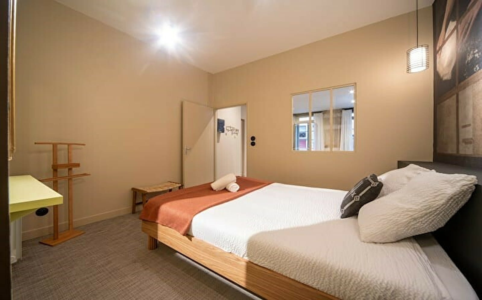 Dotée d’un lit queen-size, de tables de chevet intégrées dans le mur, et d’éclairages suspendus pour une ambiance moderne, cette chambre est une invitation au repos.