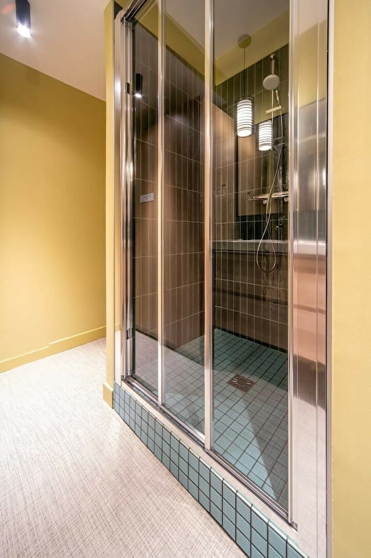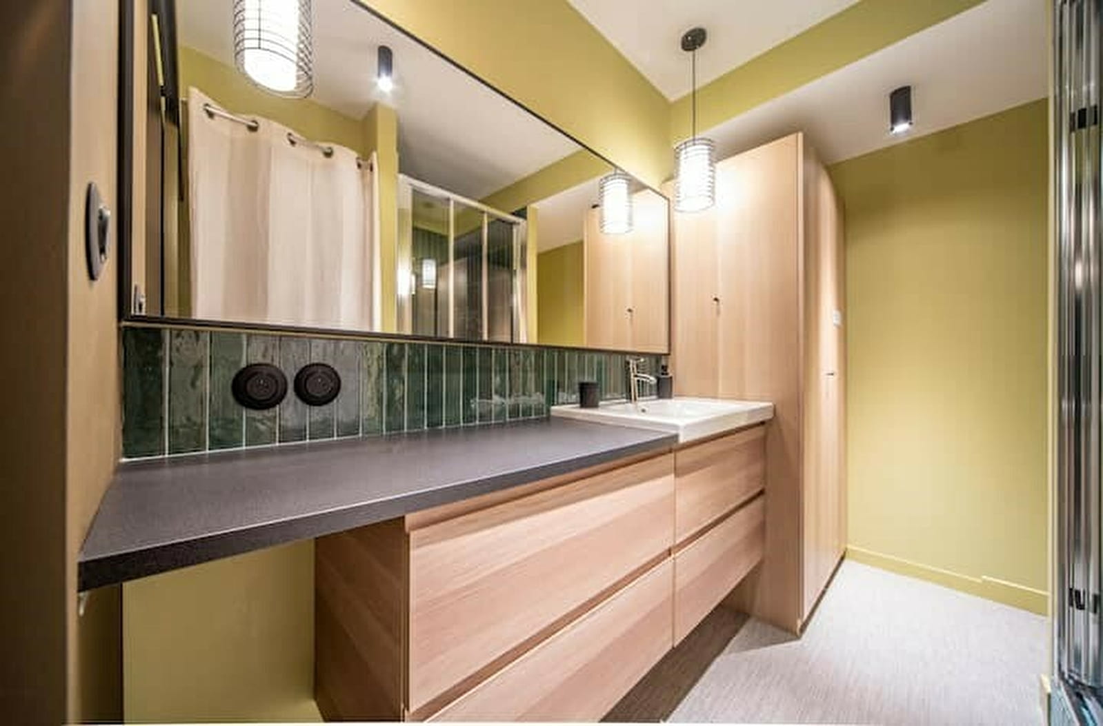 Les nuances de vert, en parfaite résonance avec la chambre et la cuisine, tissent un décor apaisant et visuellement cohérent.