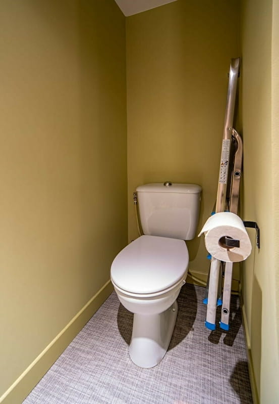 Finalisez votre découverte avec une salle de bains élégante équipée d'un vaste miroir qui agrandit l'espace, un meuble vasque, une douche spacieuse pour une relaxation optimale, ainsi qu'un espace buanderie pratique et des toilettes discrètes.