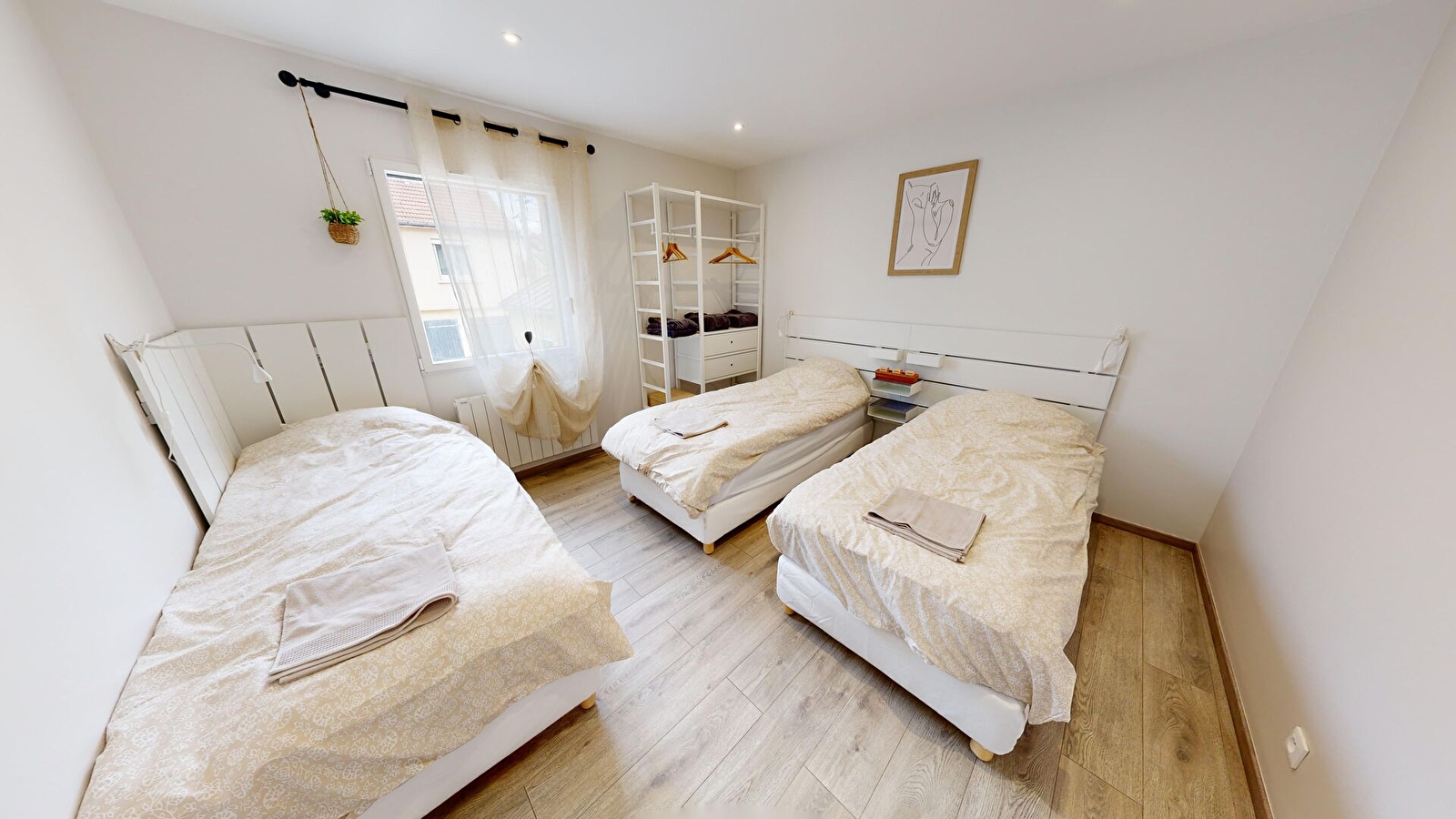 A l’étage, le coin nuit offre deux chambres : 1 chambre avec un lit double (140x190cm) avec alaise, oreillers à mémoire de forme et une armoire. Deuxième chambre avec trois lits simples (90x190cm) avec alaise, pouvant être jumelés si nécessaire, oreillers à mémoire de forme et un dressing.