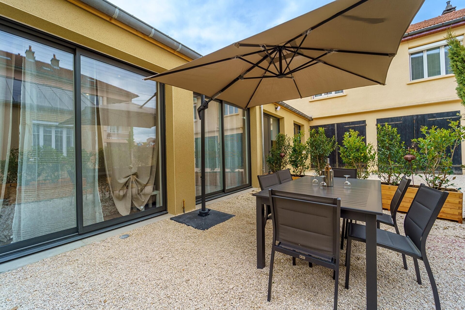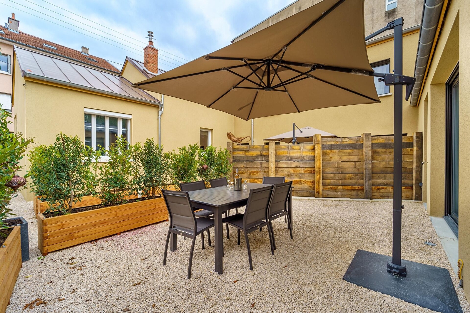 La maison dispose d'une terrasse privée non close, équipée de mobilier extérieur où vous pourrez profiter du soleil et passer des moments conviviaux autour du barbecue. A disposition : parasol, table et chaises d'extérieur, terrasse éclairée et privée, barbecue électrique Weber