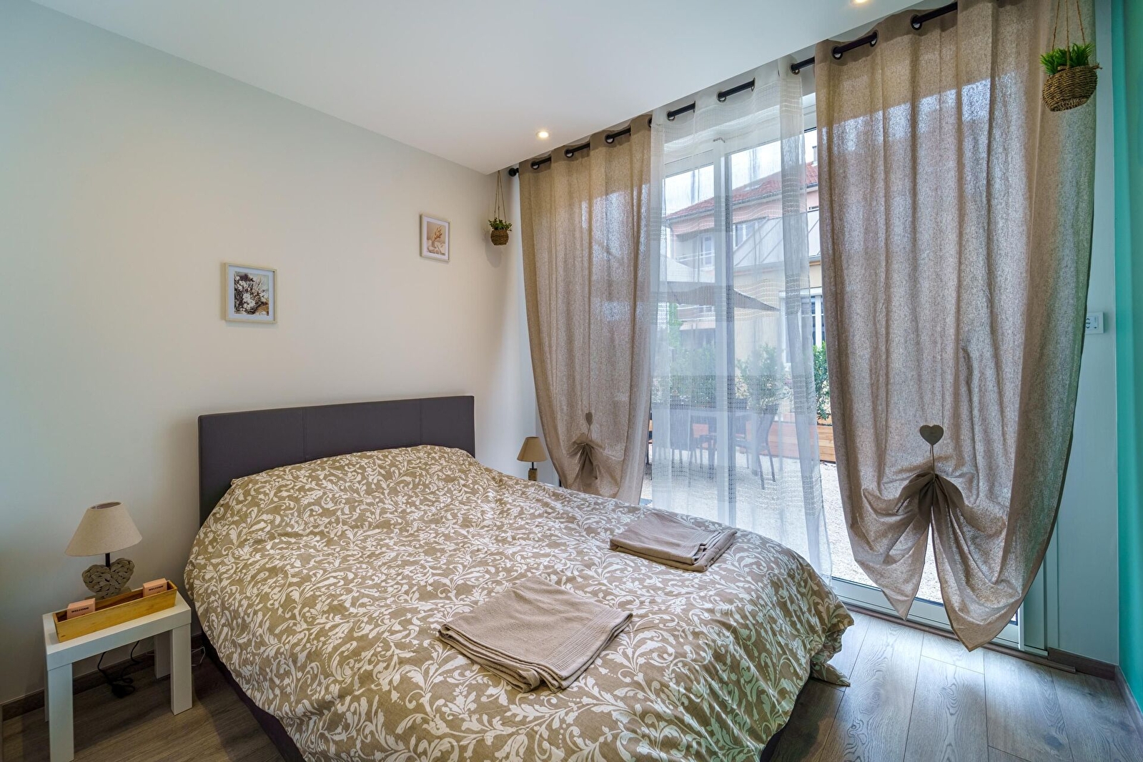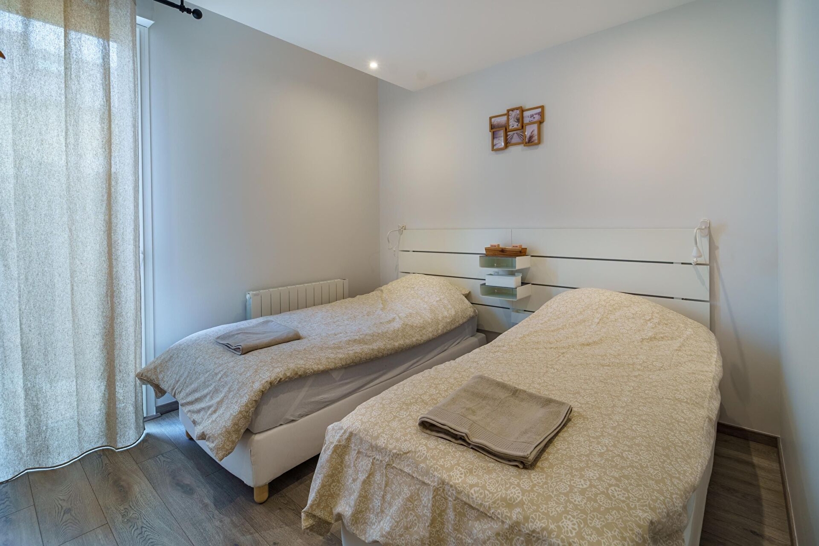 Le coin nuit offre deux chambres : 1 chambre avec un lit double (140x190cm) avec alaise, oreillers à mémoire de forme et une armoire. Deuxième chambre avec deux lits simples (90x190cm) avec alaise, pouvant être jumelés si nécessaire, oreillers à mémoire de forme et un dressing.