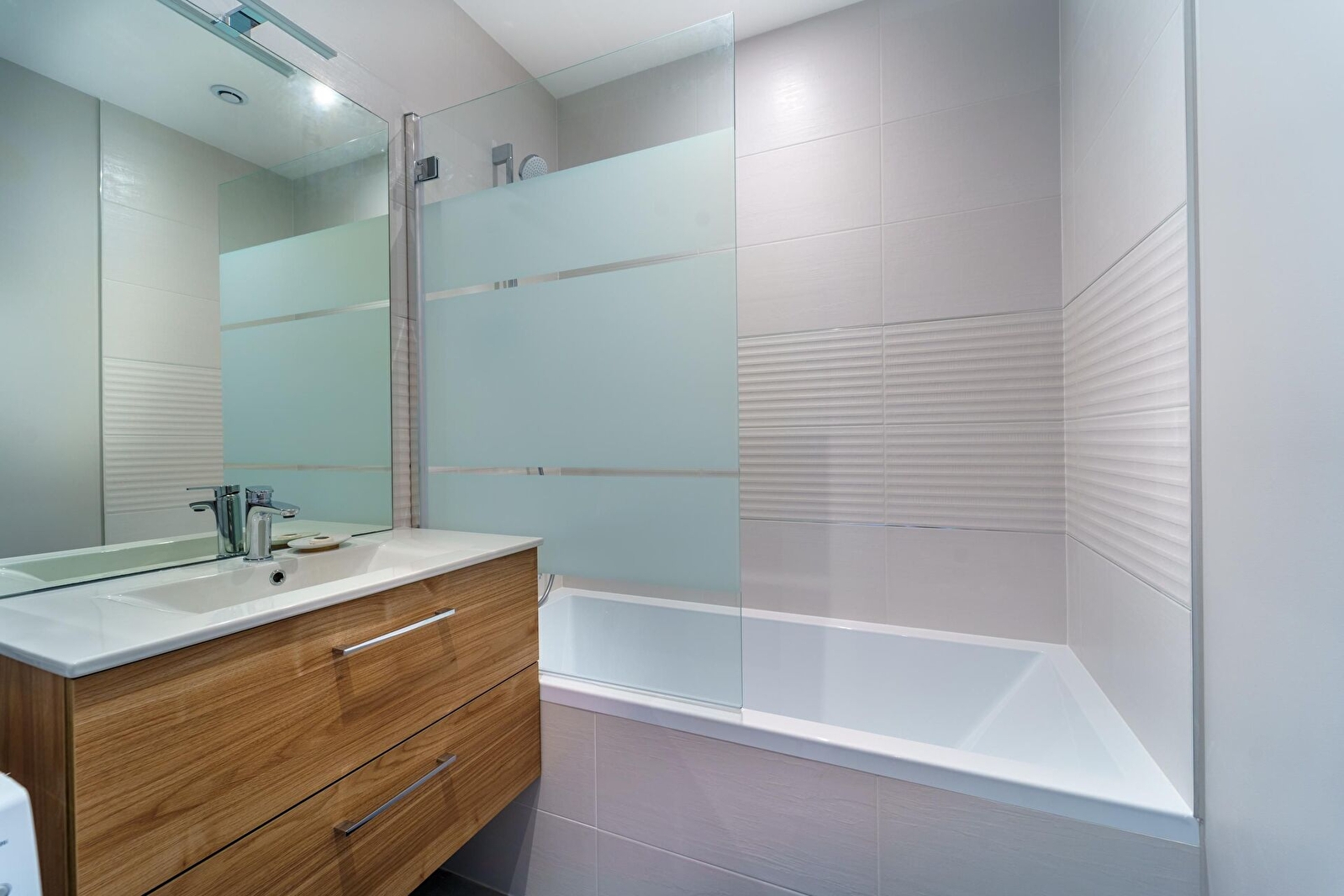 WC séparé. Salle de bain spacieuse avec baignoire, lave-linge (avec une dosette fournie à votre arrivée), sèche-linge, fer à repasser et sa table, sèche-cheveux Babyliss, kit d'accueil (savon et articles de toilette).