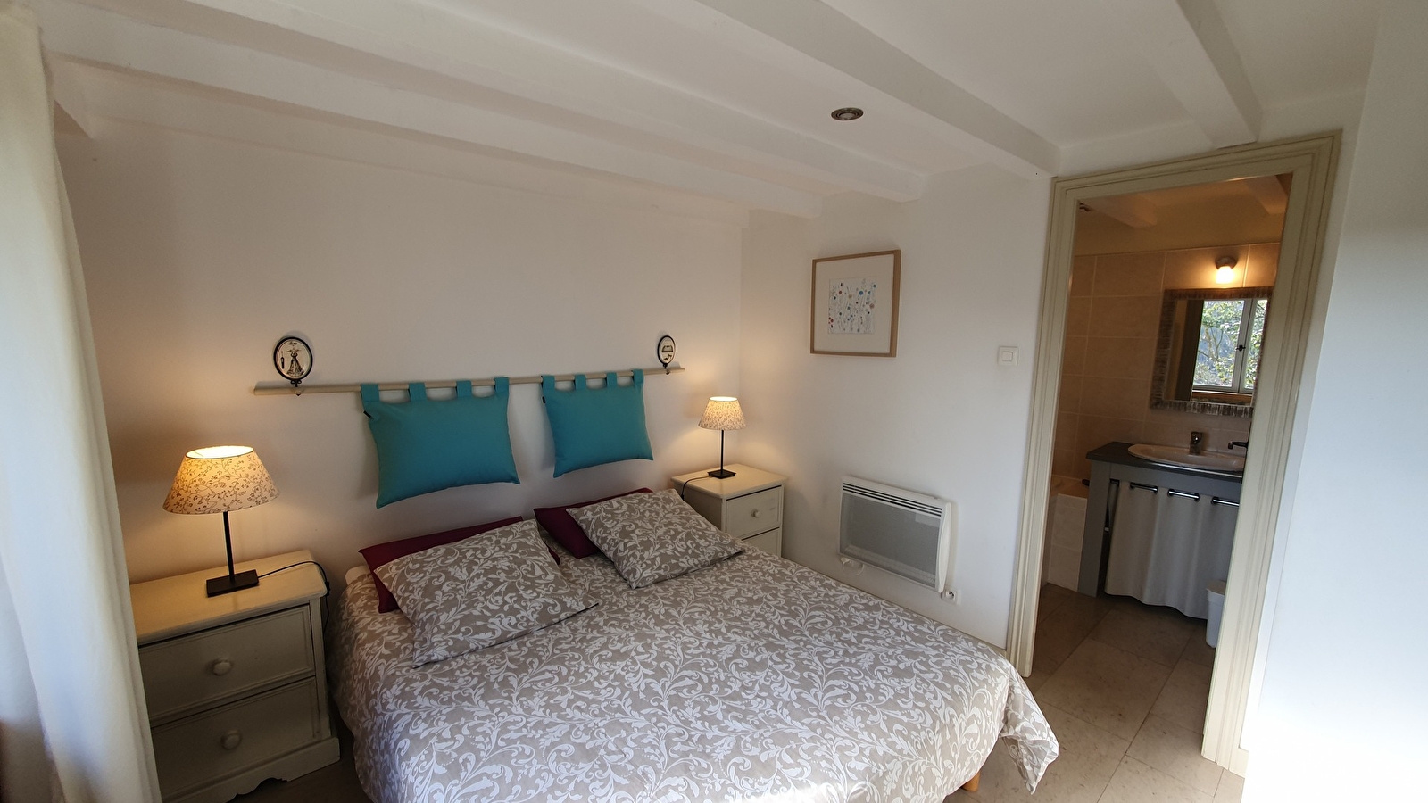 La chambre principale (rez-de-chaussée) est équipée d'un lit double (160x200) + salle de bains privative avec WC et baignoire.