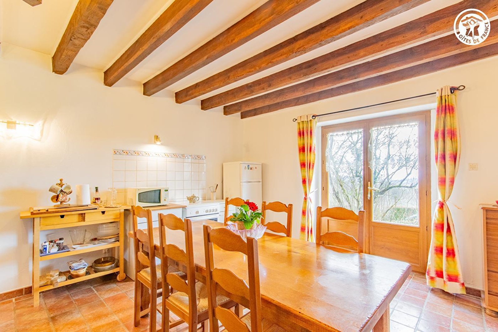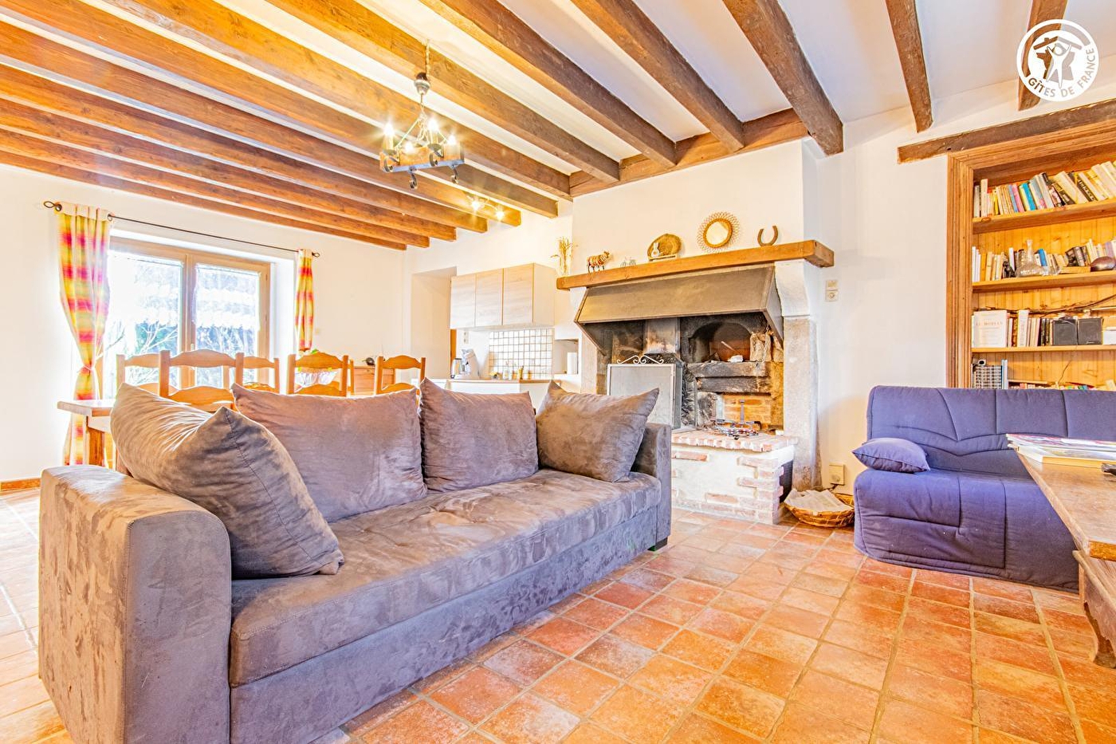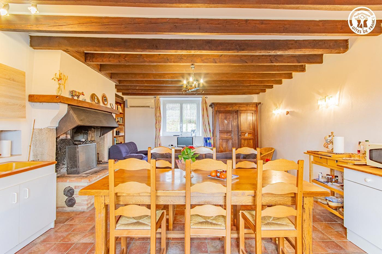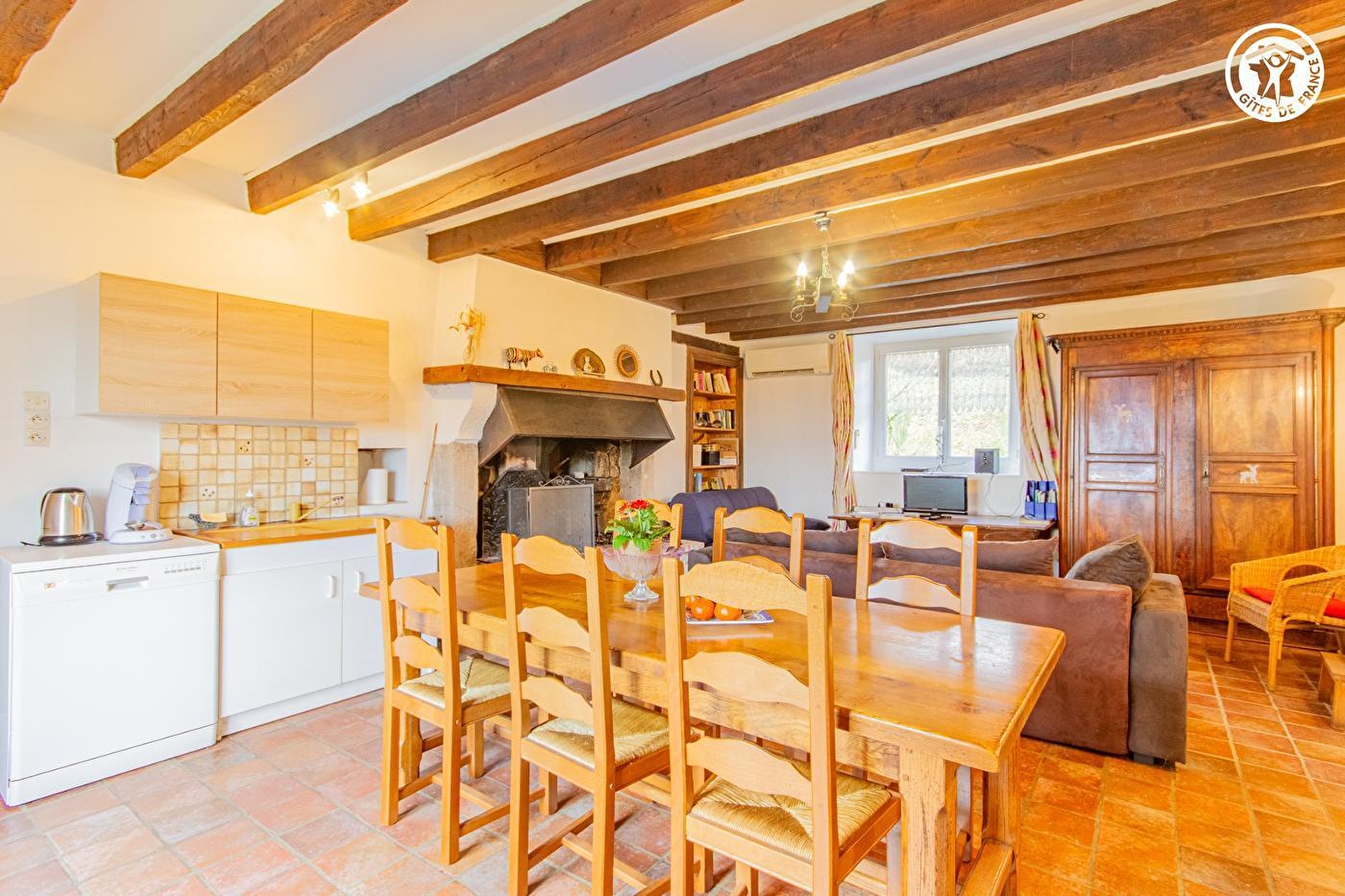 Composition : Gîte mitoyen habitation propriétaire (indépendance totale). Wifi (fibre). Chauffage PAC. Cheminée. Climatisation. Rdc : séjour-cuisine-salon, 1 chambre (3 lits 1 p. 90x190cm dont 2 superposés), dégagement, salle d'eau (douche/Wc). 1er étage : chambre en mezzanine (lit 2 p. 140x190cm). Jardin + parking privés. Local vélos. Propriété en commun (5000m²). Supérette 9 km. Supermarché à 18 km.