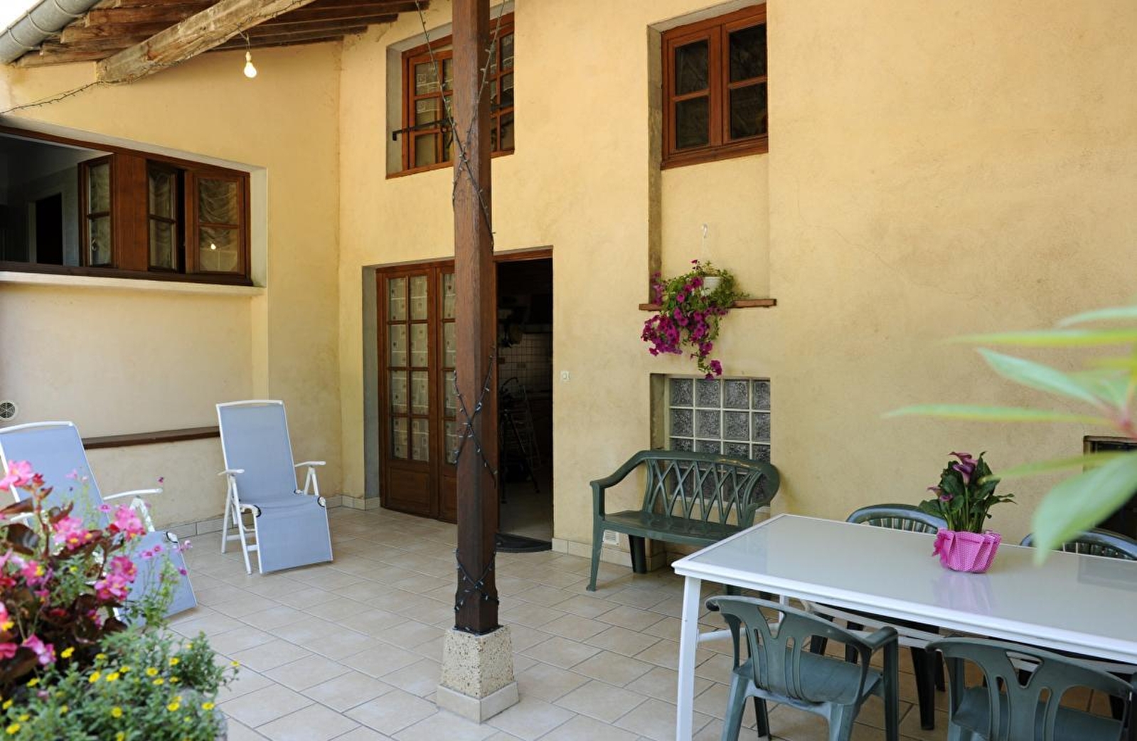 Composition : Maison de village mitoyenne jouxtant habitation propriétaires (indépendance totale). Wifi. Chauffage central gaz. Rdc : séjour-cuisine, 2 chambres (lit 2 p. 140x190cm / lit 2 p. 140x190cm + lit 1 p. 90x190cm), salle d'eau (douche), Wc indépendant. 1er étage : salon TV. Terrasse close couverte + balconnet + parking privés. Terrain commun avec propriétaires (cour/jardin). Toutes commodités 2 km.
