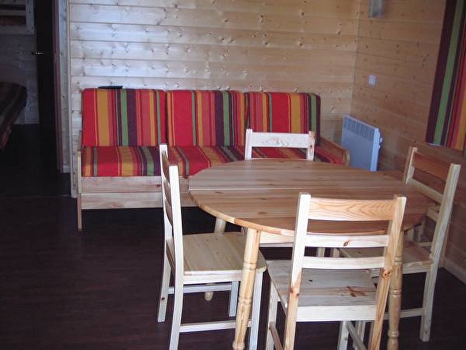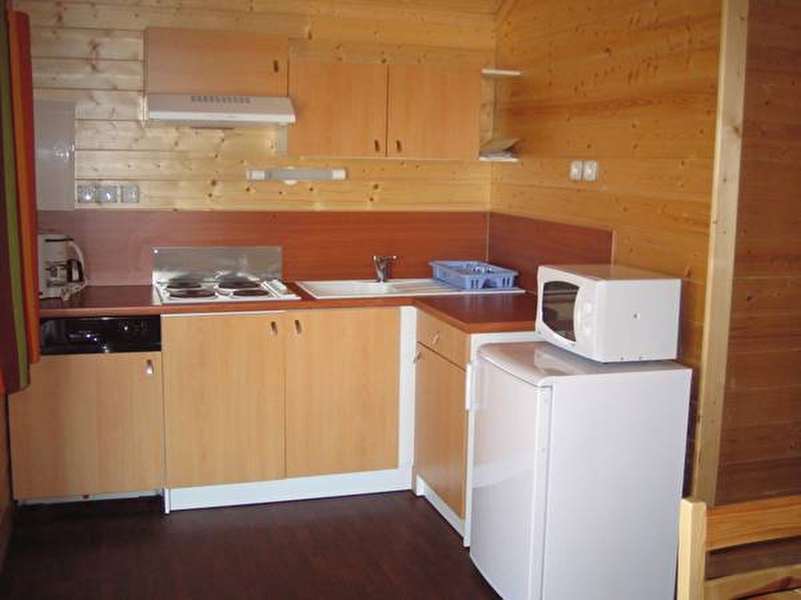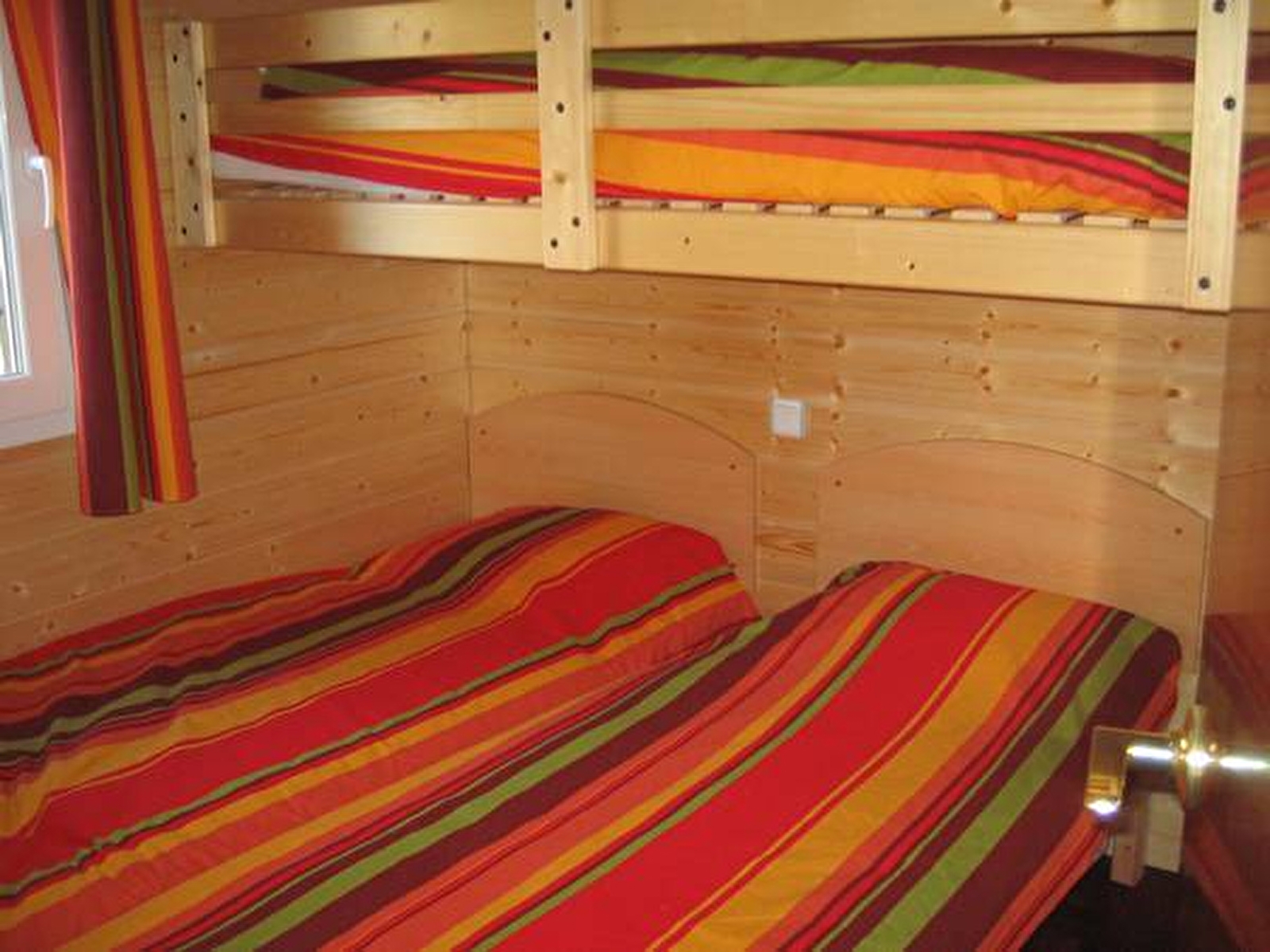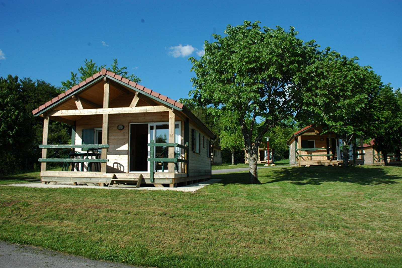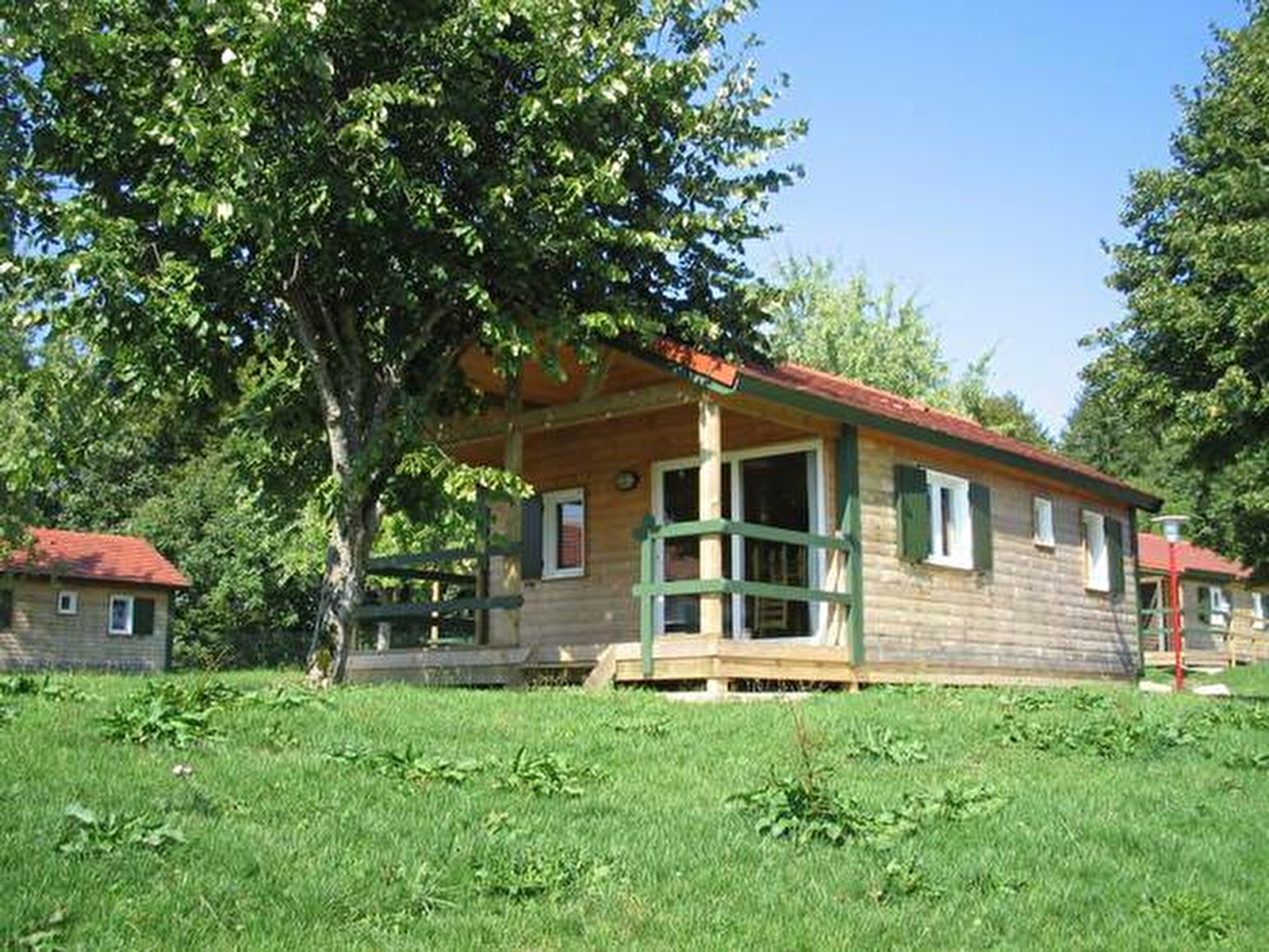 Village de chalets "Les Chalets du Bois Joli", piscine du camping, 10 m² de terrasse couverte, salon de jardin, bains de soleil, barbecue, belle exposition, accès à la pièce à vivre : coin repas, coin cuisine : Lave Vaisselles, 4 plaques, four, Micro-Ondes, hotte, frigo, coin salon : banquette-lit, TV, 2 petites chambres : 1 lit de 140 et 3 lits de 1 personne, avec rangement, salle d'eau, WC.