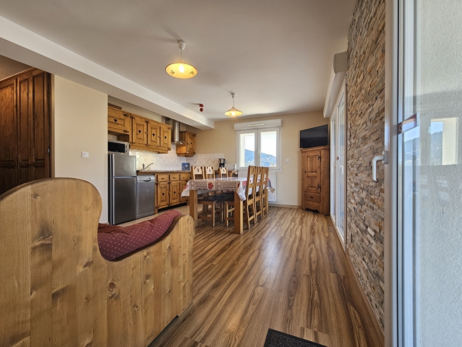 Situé dans la résidence "Les Chalets de la Dôle", cet appartement de 48m² au 1er étage, est composé d’une pièce principale avec cuisine ouverte, coin repas surélevé et canapé lit gigogne (2x80cm). Une chambre indépendante avec lit de 140cm et lits superposés de 90cm. Salle d’eau et WC. Garage privé.