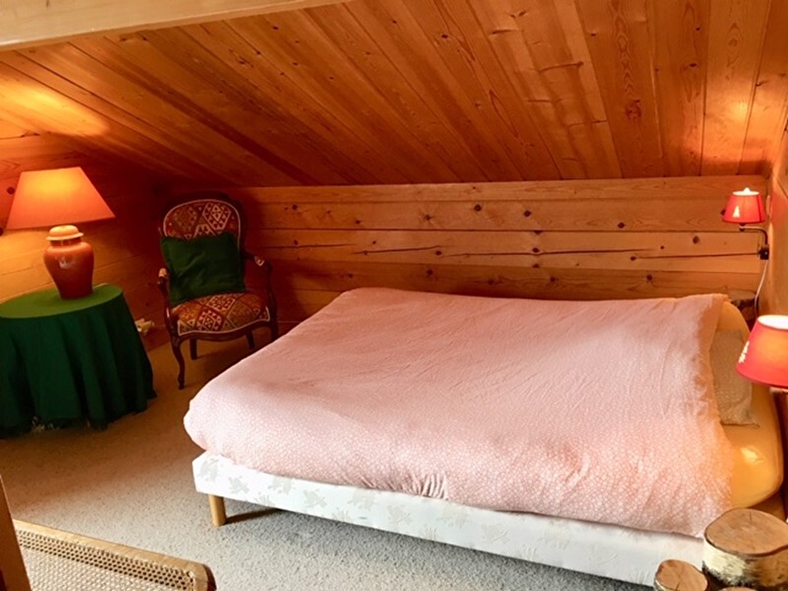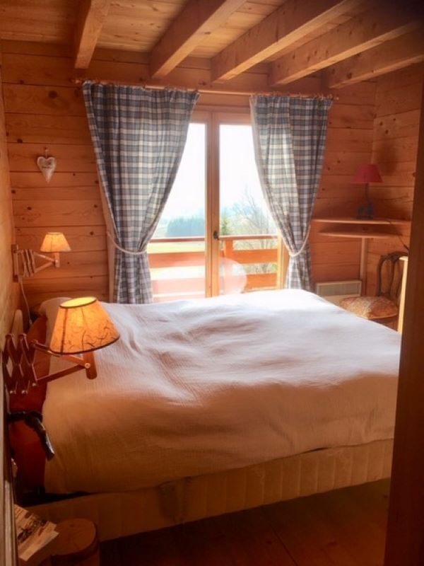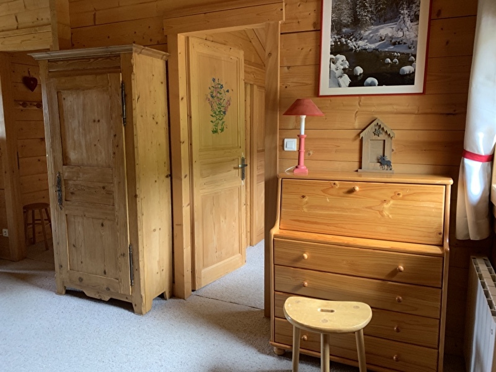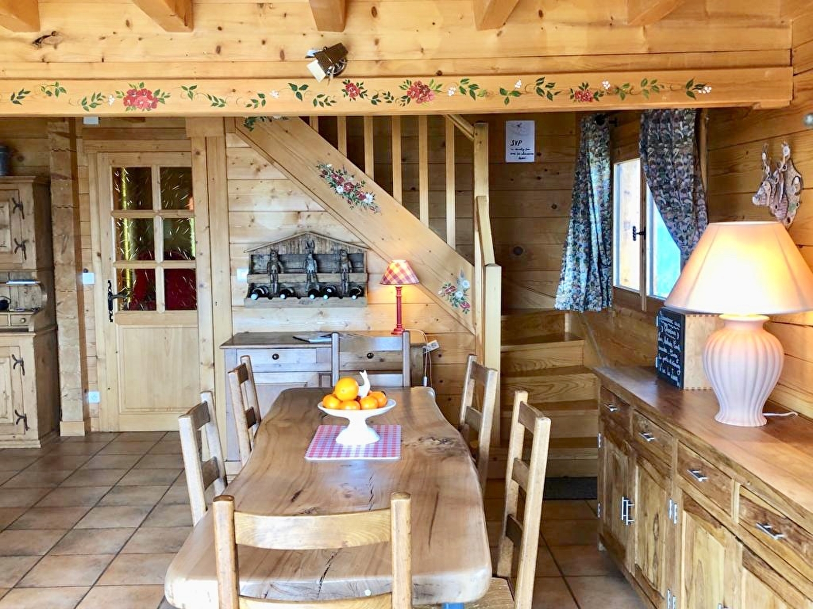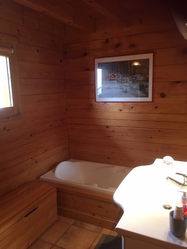 Chalet indépendant, vue splendide sur vallée, pas de vis-à-vis. Parking 3 voitures. Au rez de chaussée: grande terrasse en bois de 40m² donnant sur le salon avec télévision et lecteur DVD, cheminée, séjour, cuisine aménagée entièrement équipée, CH1: 1 lit 2 pl (160X200), salle de bains avec wc. A l'étage: mezzanine coin détente, CH2: 1 lit 2 pl (140x190), lavabo, CH3: 1 lit 2 pl (140x190), lavabo. salle d'eau et wc communicants aux 2 chambres. Sous-sol avec buanderie (lave linge et sèche linge, table et fer à repasser). Local à skis. CHALET NON FUMEUR. Équipement bébé : lit parapluie et chaise haute. Linge de lit et de toilette non fournis. (Caution ménage : 150€)