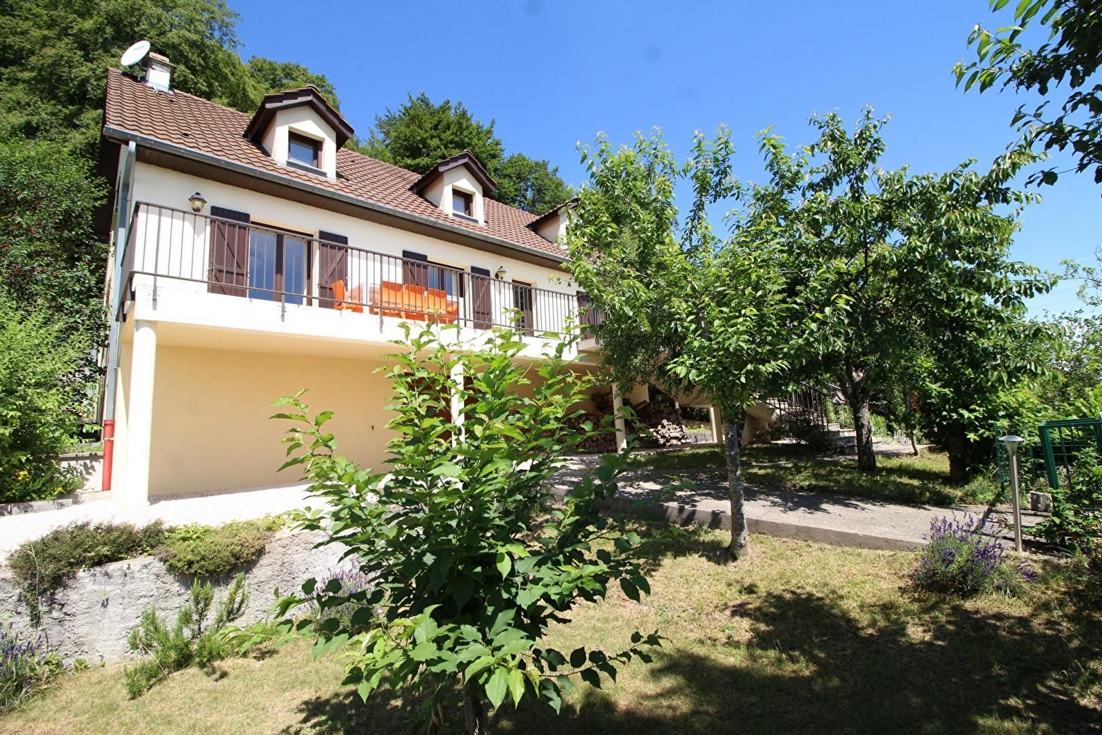 Extérieurs sécurisés et coin pelouse pour les enfants. 2 garages en contre-bas.