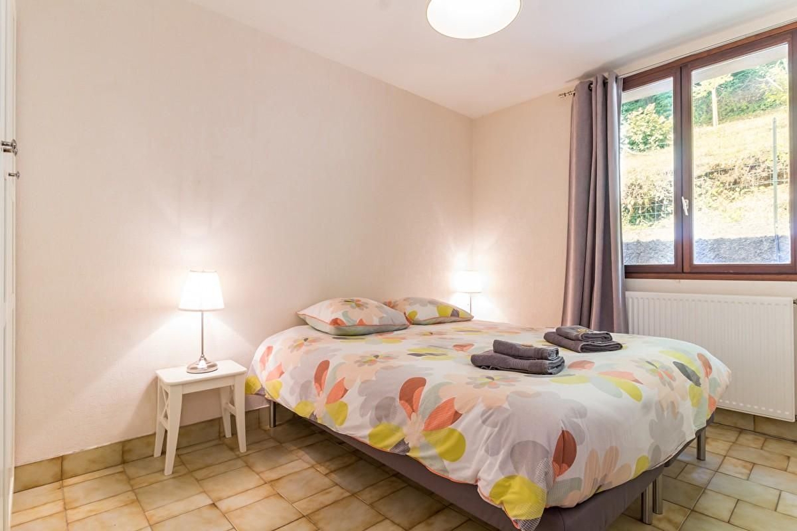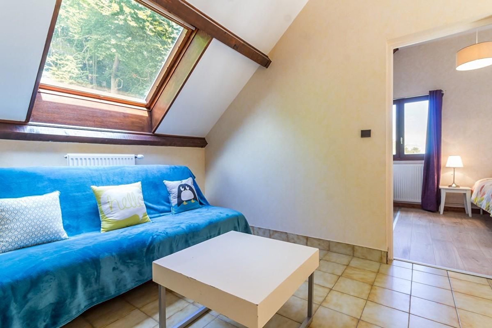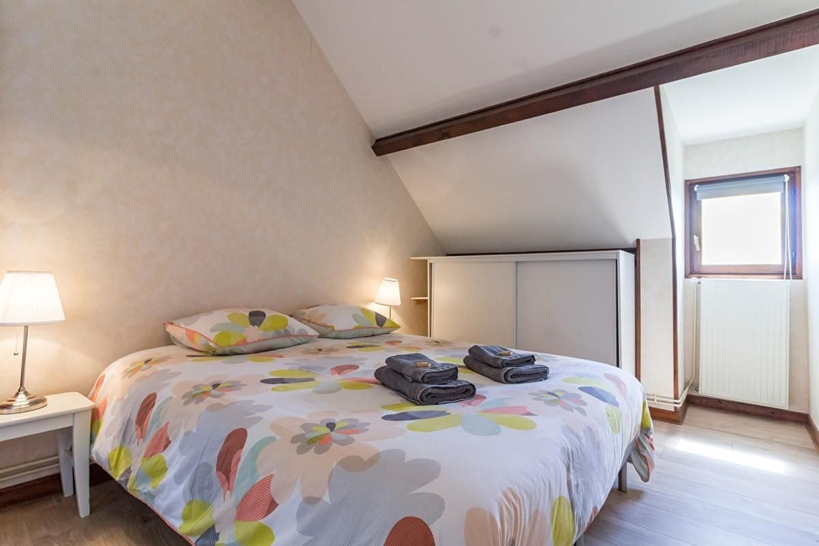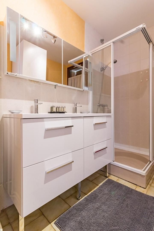 A l'étage : une chambre avec et sa propre salle d'eau attenante avec deux lits simples. Une autre chambre avec un lit 140 et une dernière chambre avec 4 lits 90 (jumelage possible). Salle de bains avec WC.