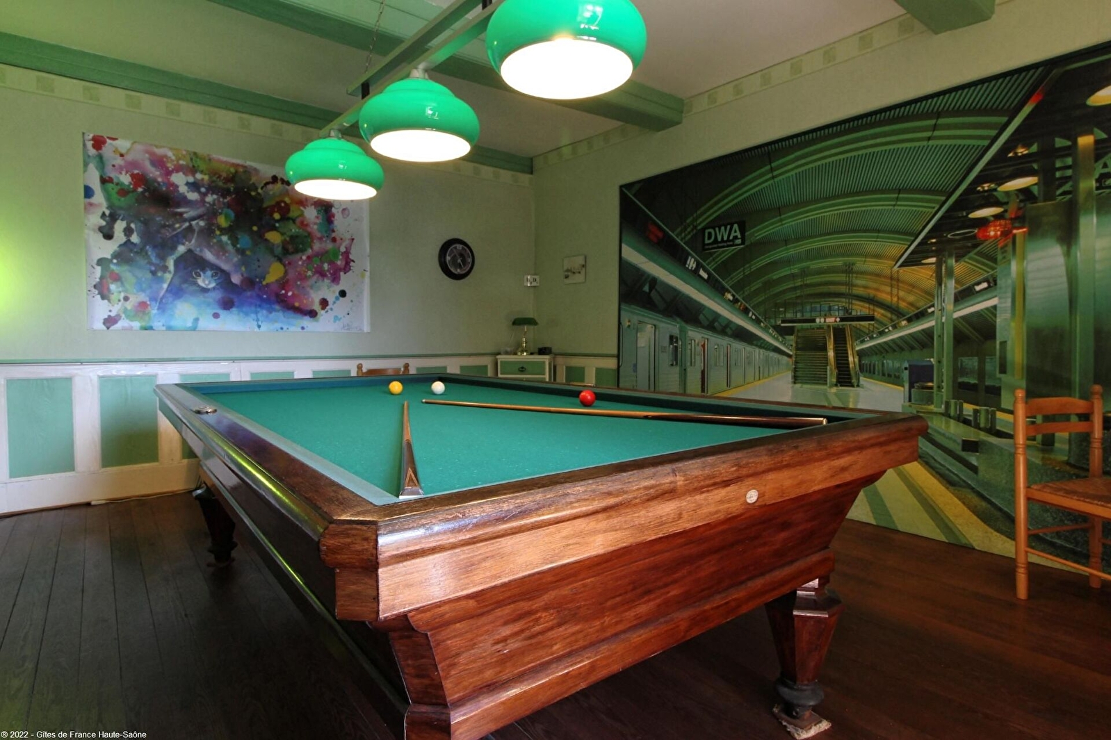 En rez-de-chaussée, cuisine, salon avec télévision, salle à manger avec mezzanine abritant un petit musée familial et grande salle de jeux avec billard français, jeu d’échecs et de fléchettes.