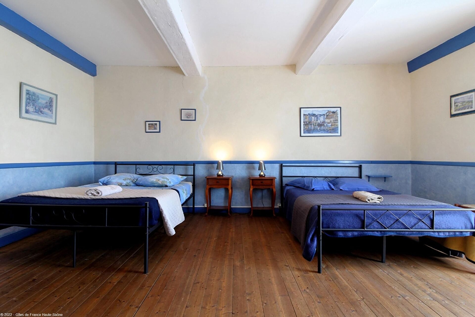 À l'étage, deux chambres, l’une dotée d’un lit 140 cm, l’autre de trois lits 140 cm et deux salles de bains dont une communicante sur palier. Lit bébé. WC. Gîte tout compris (linge de cuisine, de toilette, de lit, chauffage électrique et électricité inclus ainsi que le ménage).