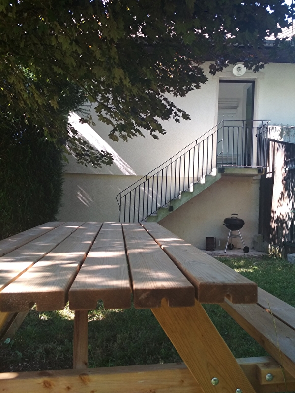 A l'extérieur, une table forestière est installée à l'ombre des arbres du jardin ainsi qu'un barbecue.