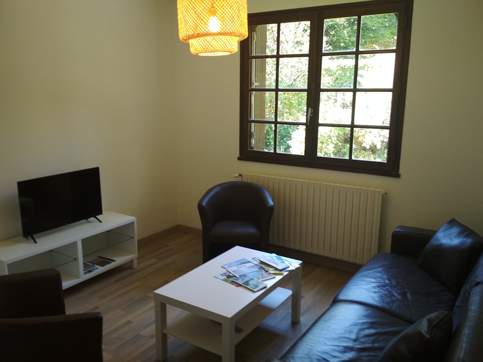 Un salon avec grand canapé en cuir convertible en couchage 160 X 190, 2 fauteuils, une TV connectée.