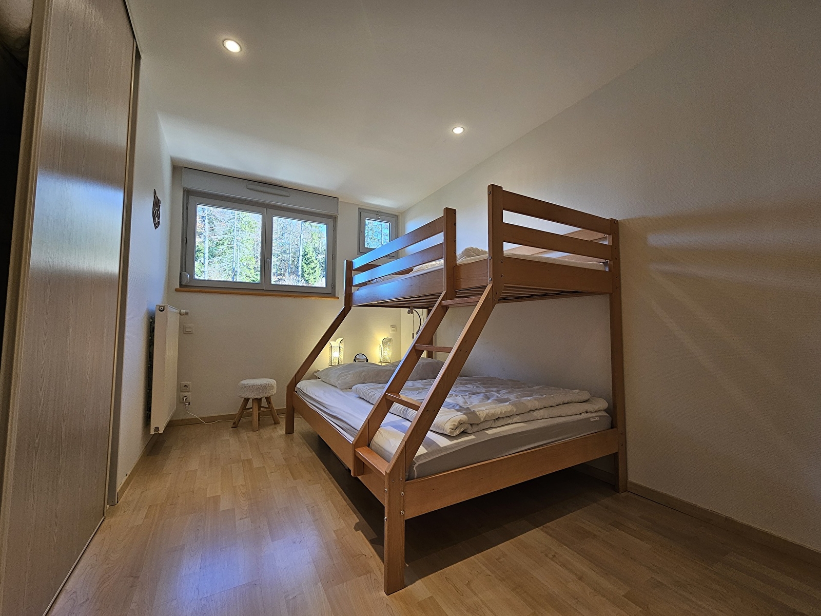 L’espace nuit est composé de 2 chambres, l’une avec un lit en 160 et accès au balcon, la seconde avec un lit superposé avec un lit en 140 en dessous et un lit en 90 au-dessus. Salle d’eau et WC séparé.