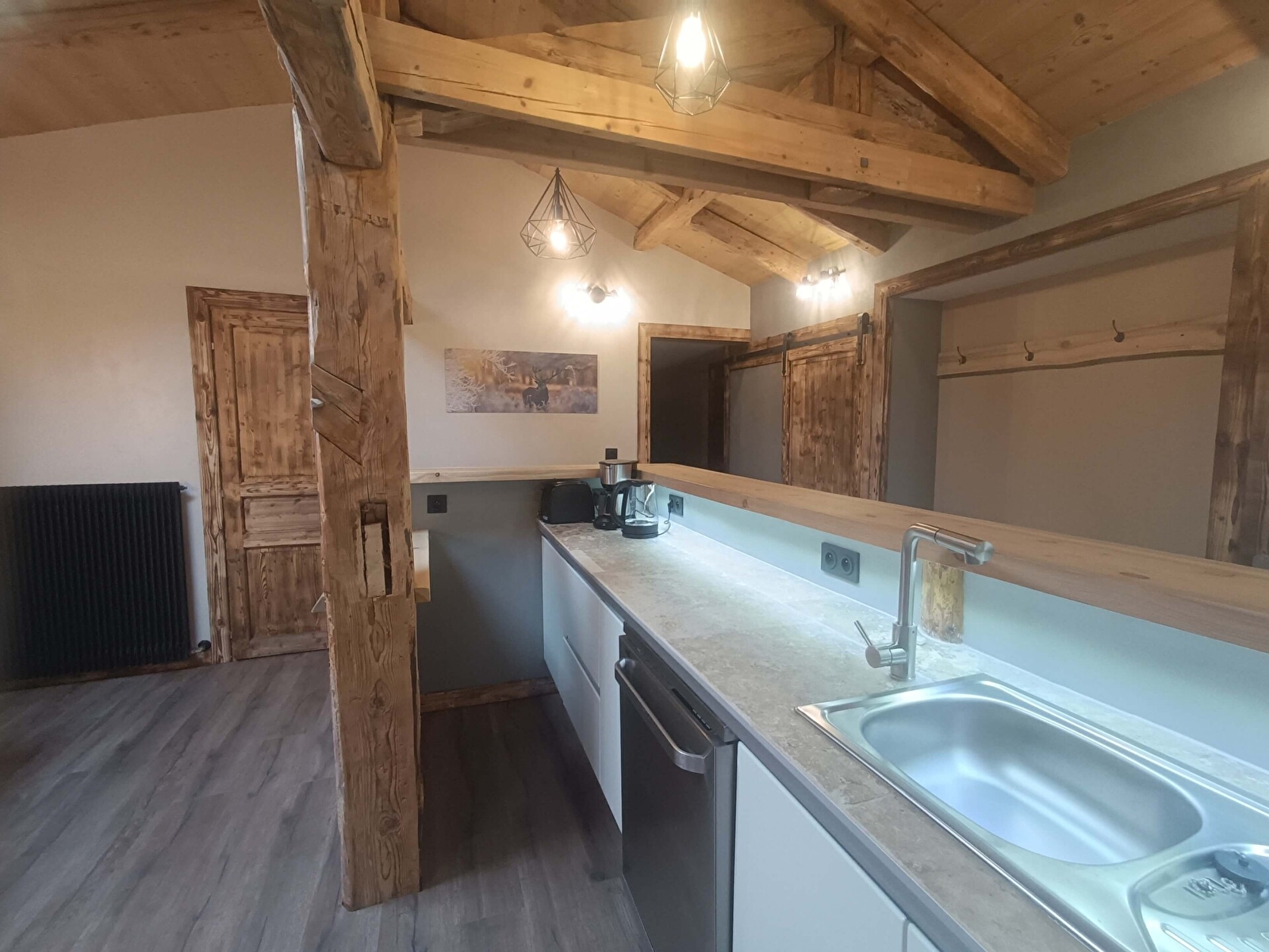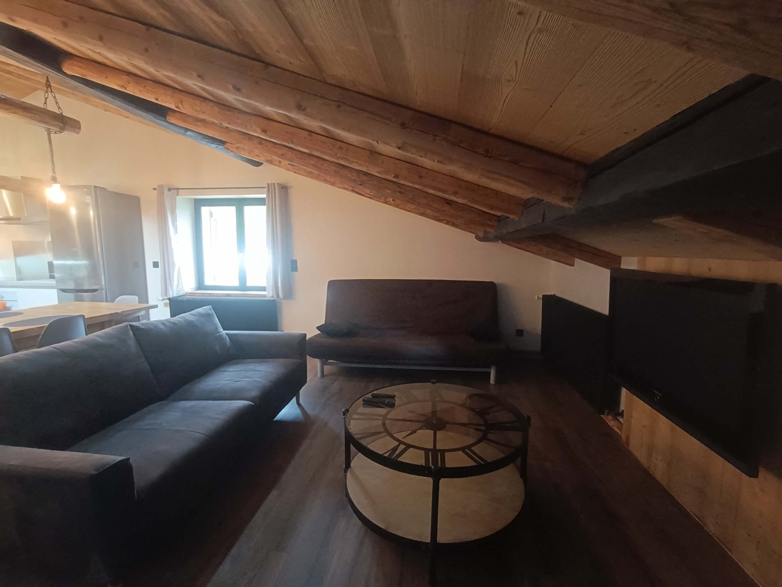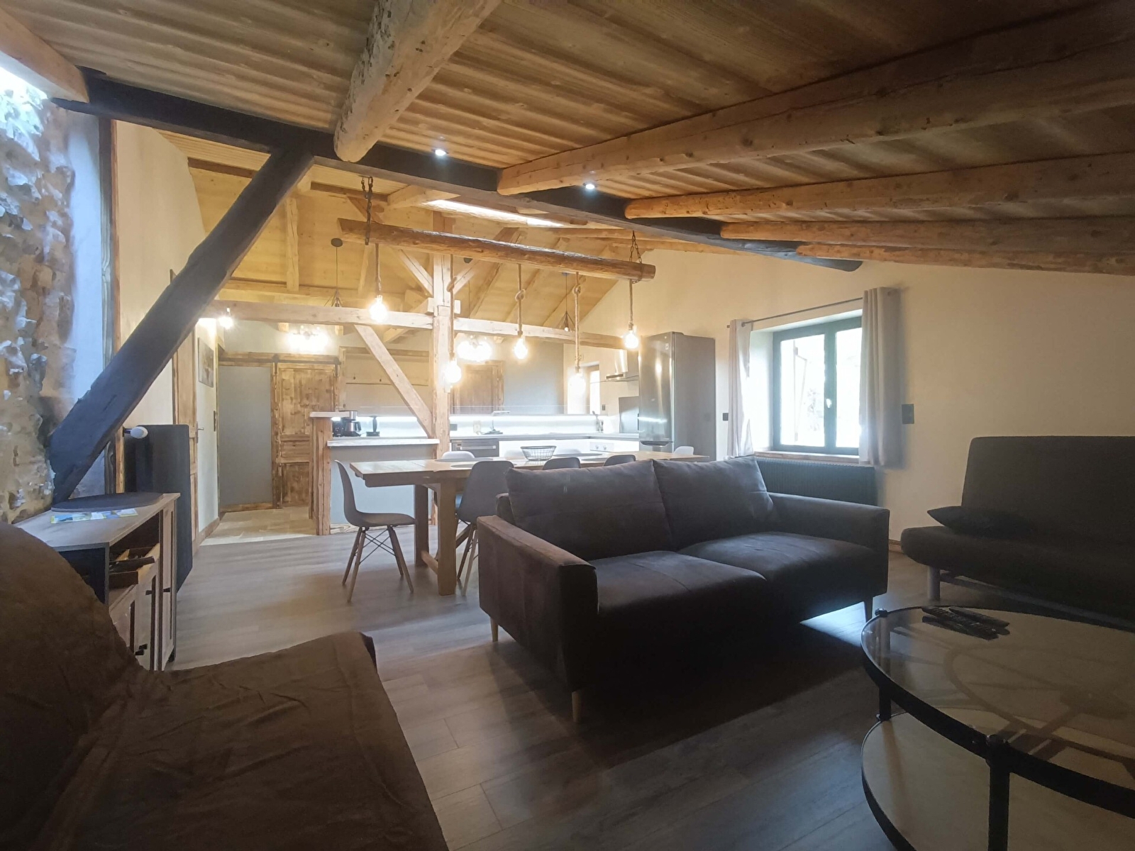 Composé d'un grand salon et d'une cuisine ouverte toute équipée, sous la pente de toit créant une impression de hauteur, avec les poutres d'origine de la maison.