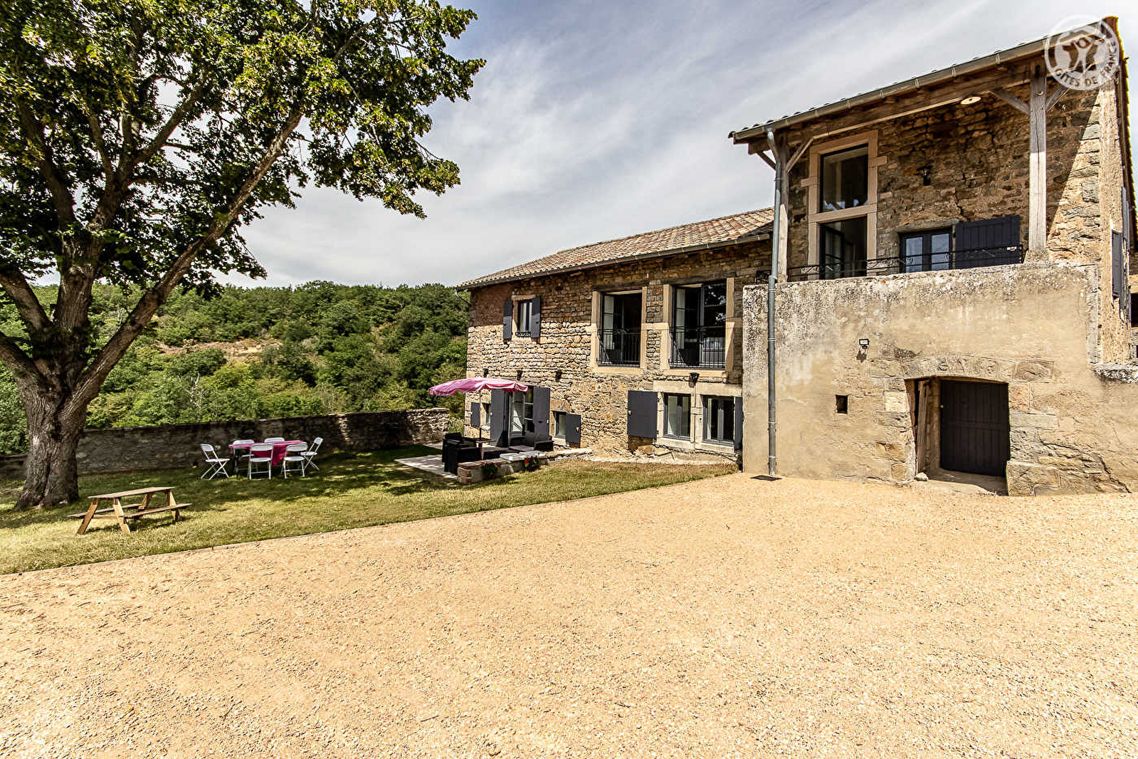 Authentique ferme bourguignonne de caractère du 18ème siècle chargée d'histoire (naguère liée au château voisin des Thinons) - restaurée avec soins - sise sur une vaste propriété privée « naturelle » de 3 ha. Au calme, au sein d'un charmant petit hameau familial lové sur un plateau à flanc de coteau sud, en lisière immédiate de prairies & forêt, au creux d'un ravissant cirque champêtre préservé (le privilège rare de pouvoir observer la faune sauvage depuis le gîte !). Cadre enchanteur. Magnifique écrin de verdure surplombant Berzé-le-Châtel, pittoresque paisible village blotti en balcon au cœur des vignobles réputés du Val Lamartinien (Côtes Mâconnaises), abritant l'imposante forteresse médiévale de Berzé (Xème siècle), exceptionnel joyau patrimonial de Bourgogne qui trône en son centre (somptueux château-fort entre autres doté de quatorze tours, d'une chapelle carolingienne et de plusieurs jardins « à la française » & « à l'anglaise »). Spacieux gîte de grand confort. Chaleureux cachet campagnard d'esprit contemporain aux influences nordiques. Beaucoup de charme. Élégant mariage architectural entre modernité et traditions que sublime un vaste salon « cathédrale » à l'imposant volume (charpente et mur en pierres d'origine). Cocooning & très cosy. A l'extérieur, une terrasse exposée avec salon de détente jouxte un agréable jardinet doté d'un salon de jardin à l'ombre d'un tilleul centenaire. Splendide vue dégagée. Panorama & paysages de toute beauté.