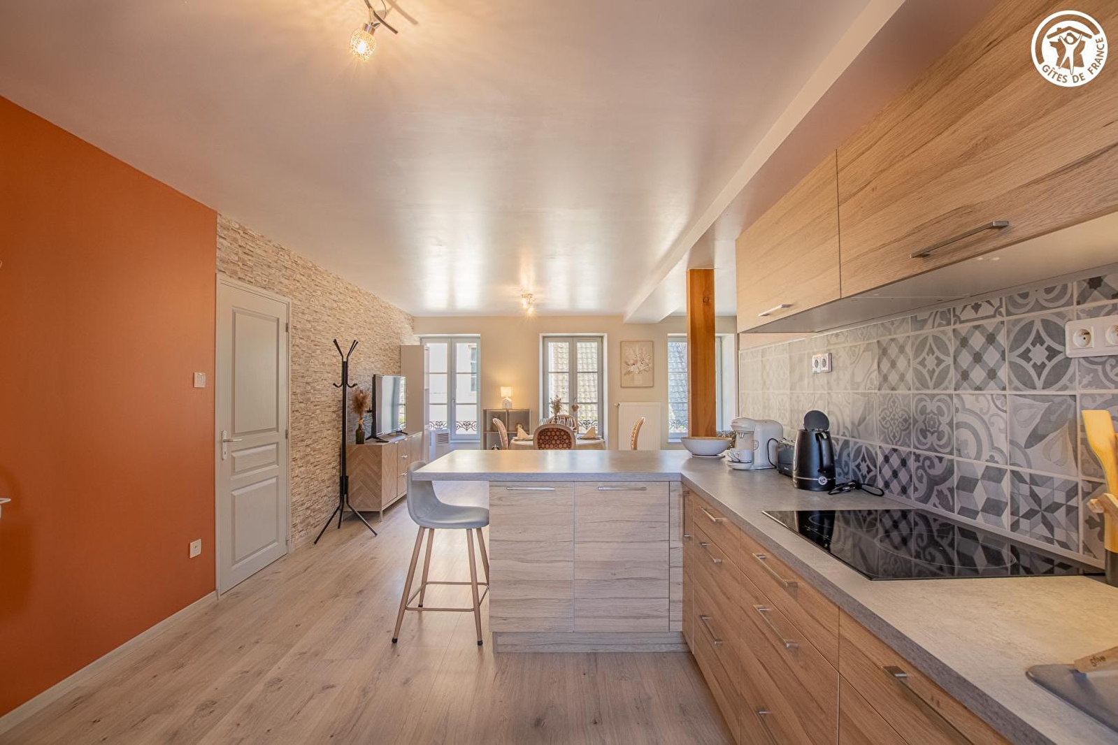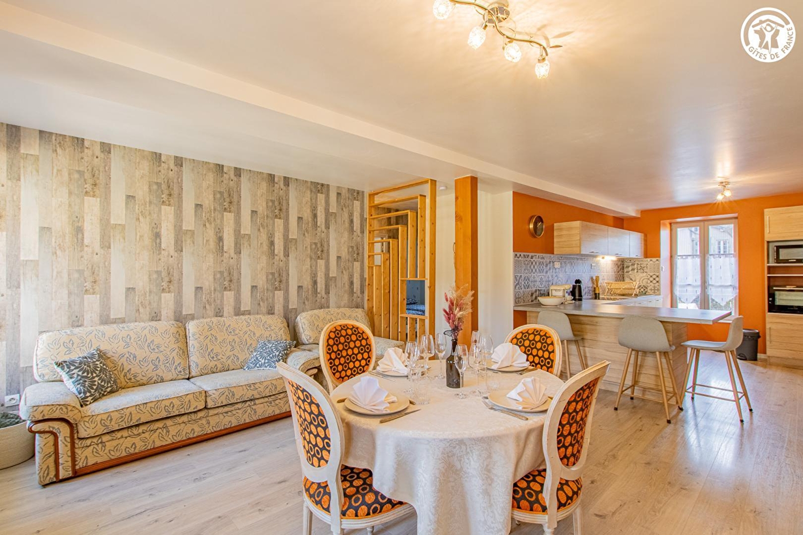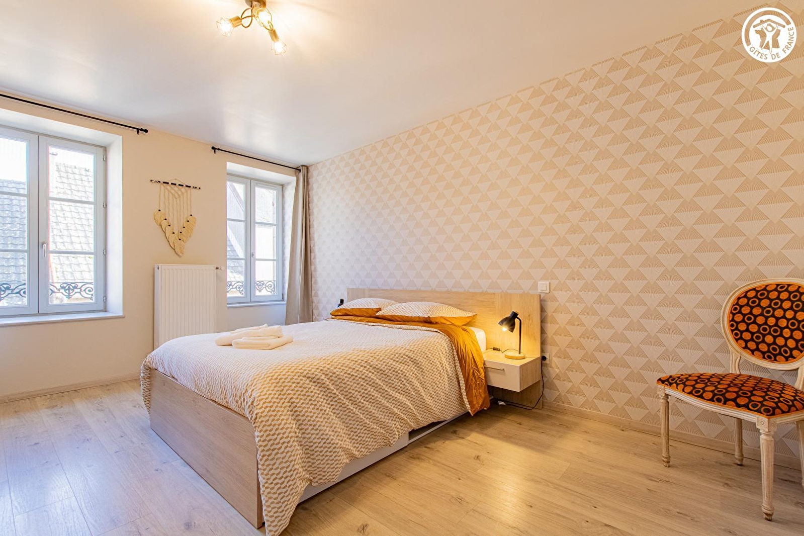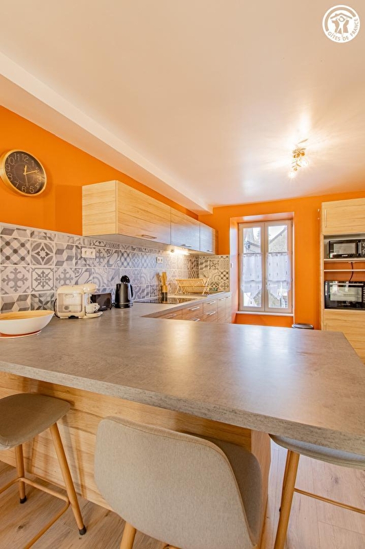Composition : Maison de village mitoyenne abritant le logement du propriétaire (entrée commune mais indépendance totale) + un petit restaurant au rdc privatisé très occasionnellement (car uniquement exploité en activité de "traiteur"). Wifi (fibre). Chauffage central gaz. Buanderie commune au rdc (accès par l'extérieur côté cour intérieure). Gîte au 1er étage : Séjour-cuisine-salon, 2 chambres (lit 2 p. 140x190cm / 2 lits 1 p. 90x190cm jumelables en lit 2 p. 180x190cm), salle d'eau (douche), Wc indépendant. Jardin + terrasse privatifs. Parking public gratuit aisé sur place (directement accessible par le jardin). Commerces sur place dont petit supermarché à 900m.