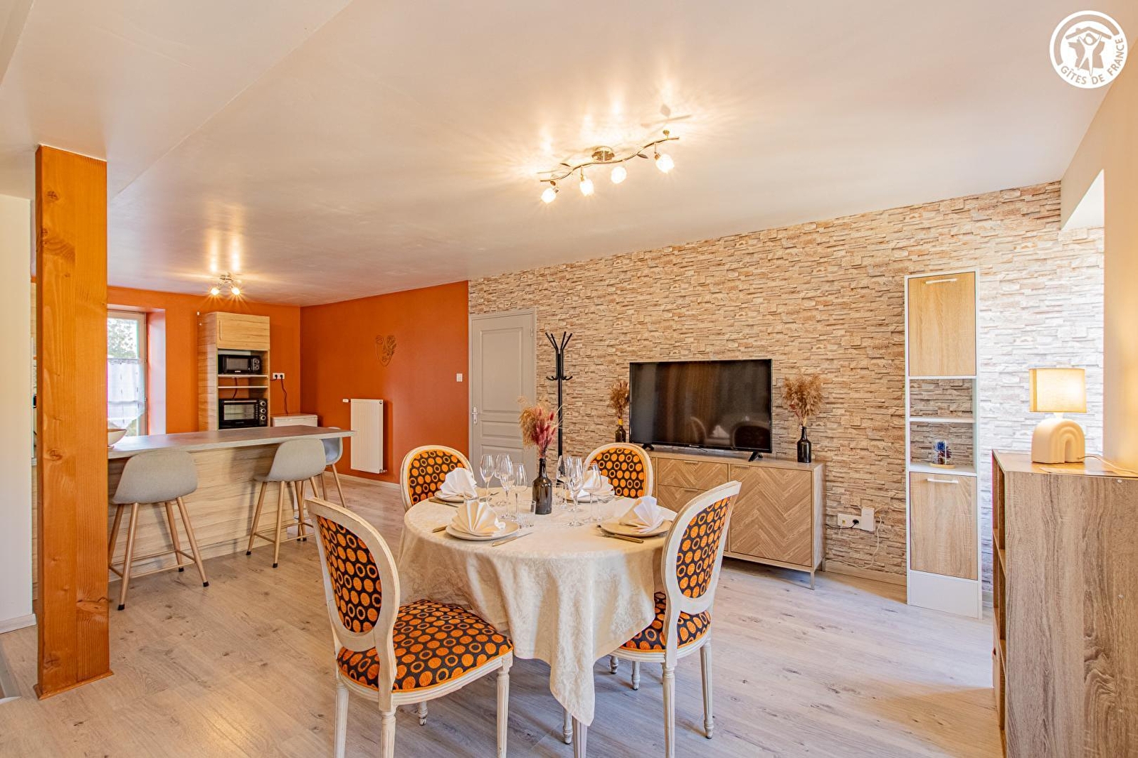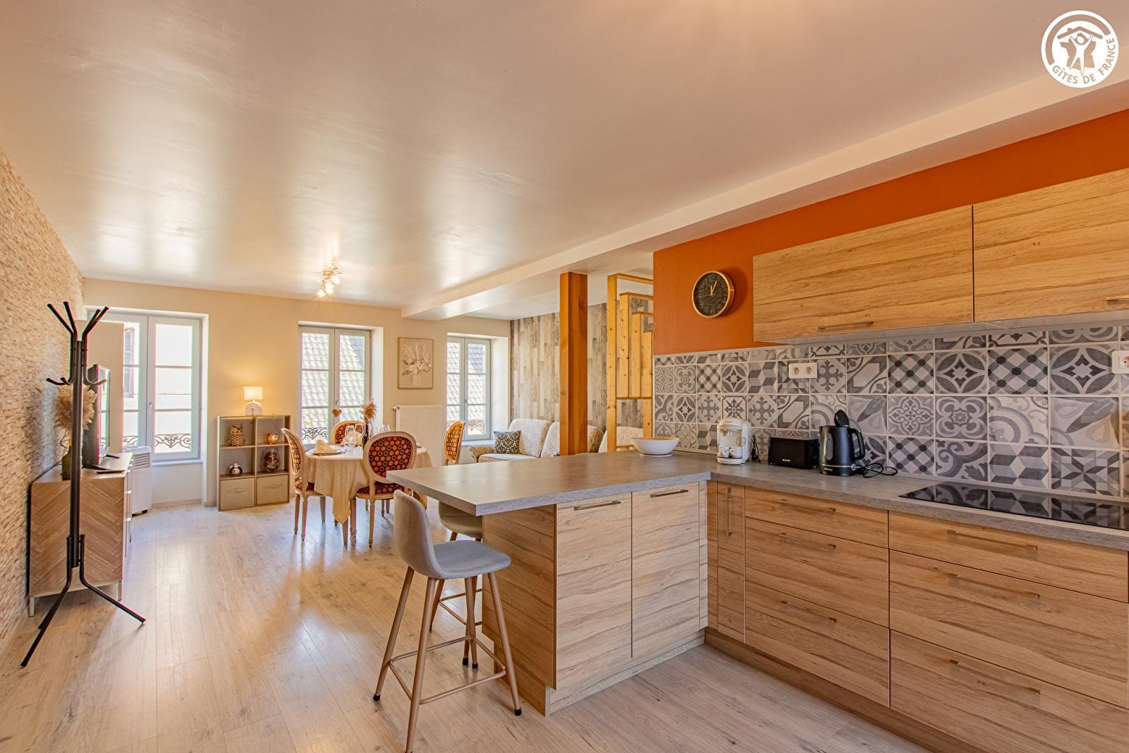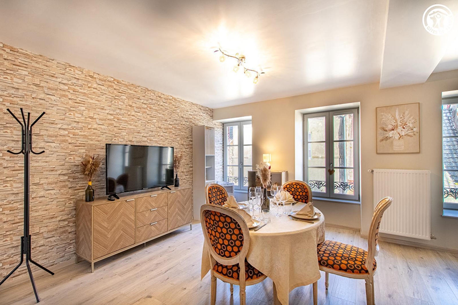 Composition : Maison de village mitoyenne abritant le logement du propriétaire (entrée commune mais indépendance totale) + un petit restaurant au rdc privatisé très occasionnellement (car uniquement exploité en activité de "traiteur"). Wifi (fibre). Chauffage central gaz. Buanderie commune au rdc (accès par l'extérieur côté cour intérieure). Gîte au 1er étage : Séjour-cuisine-salon, 2 chambres (lit 2 p. 140x190cm / 2 lits 1 p. 90x190cm jumelables en lit 2 p. 180x190cm), salle d'eau (douche), Wc indépendant. Jardin + terrasse privatifs. Parking public gratuit aisé sur place (directement accessible par le jardin). Commerces sur place dont petit supermarché à 900m.