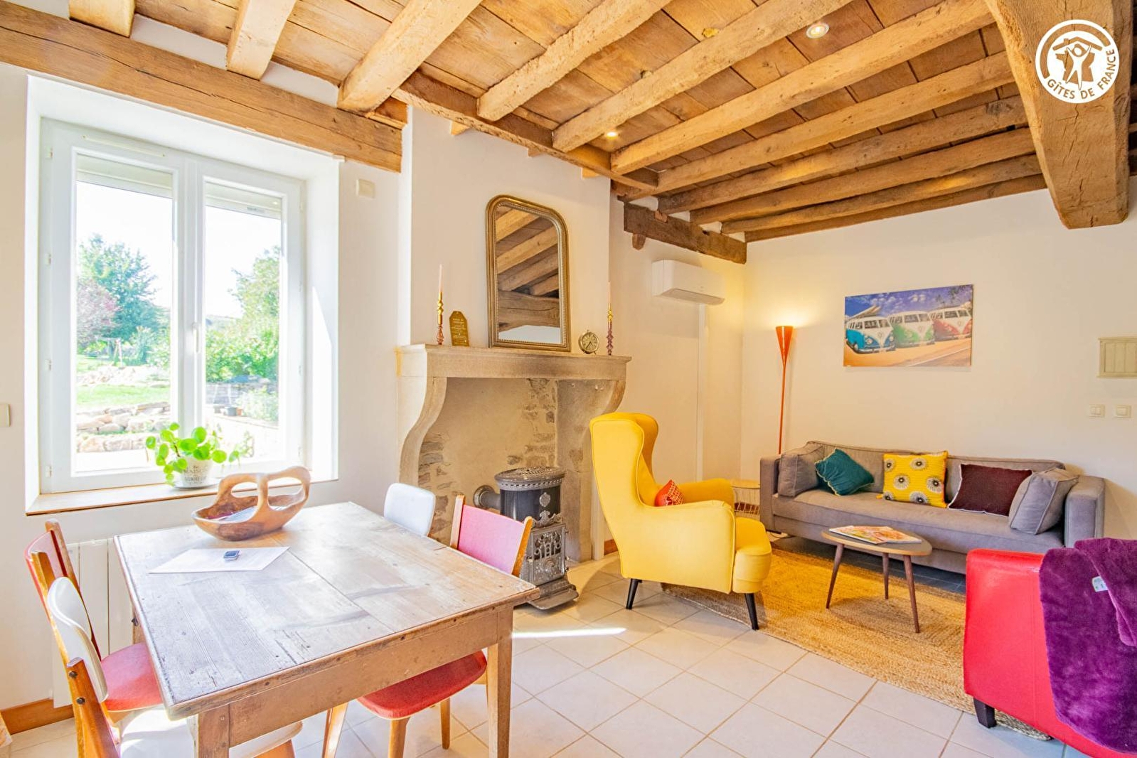 Margareth & Mickaël vous accueillent au sein d'une authentique demeure vigneronne du XIXe siècle soigneusement restaurée (ancien domaine viticole & agricole) nichée au calme en "mini impasse" & lisière de prairies boisées, à deux pas des vignes, au cœur d'un pittoresque petit hameau adossé "en balcon" à flanc de colline, belvédère de choix offrant une magnifique vue dégagée sur les environs jusqu'au Mont-Blanc par temps clair ! Totale tranquillité en pleine campagne, blotti au creux d'un sublime écrin paysagé vallonné, succession de coteaux de vignobles, forêts, rivières & prairies. Paysages & panoramas absolument enchanteurs. Village viticole typique & sauvegardé des Côtes chalonnaises - l'un des plus anciens avec sa cave coopérative produisant plusieurs AOC - Bissey-sous-Cruchaud dispose d'une aire de loisirs (city-stade, toboggan, jeux d'enfants divers, mini stade de foot) & profite d'un superbe environnement champêtre & naturel préservé. Gîte de très bon confort. Chaleureux cachet campagnard d'esprit contemporain, mixant traditions & modernité, sublimé par l'âme dépaysante des lieux (manteau de cheminée en pierres, poutres & plafond, charpente… d'origine). Beaucoup de charme. Ambiance douillette. Balcon-terrasse abrité (de plain-pied avec le gîte) dominant un agréable jardin clos de 1000m² (avec portail électrique) soigneusement paysagé (végétalisé, arboré & fleuri), disposant d'une balançoire & d'une très rare insolite "piscine biologique" en baignade naturelle de 8x4m.