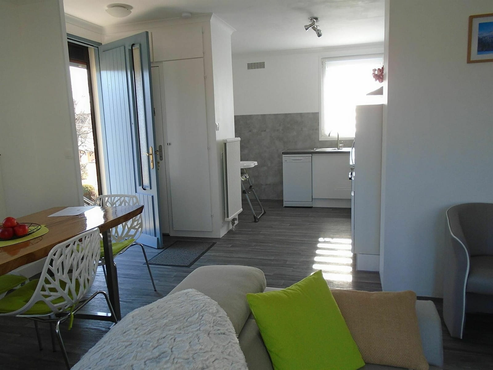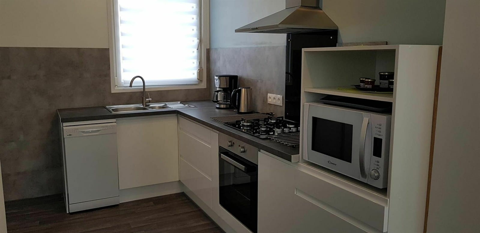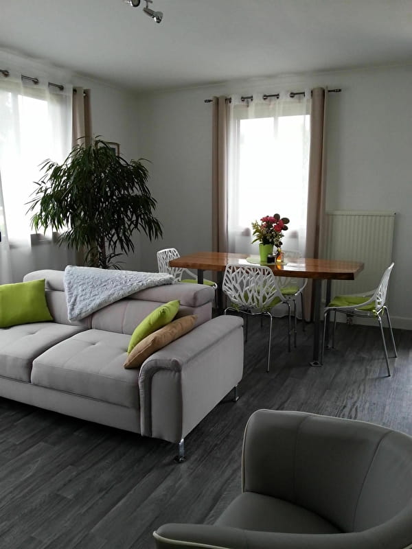 Maison individuelle pour 4 personnes, à l'étage. L'hébergement comprend une grande pièce de vie ouverte sur cuisine équipée, canapé fixe, écran plat, wifi.